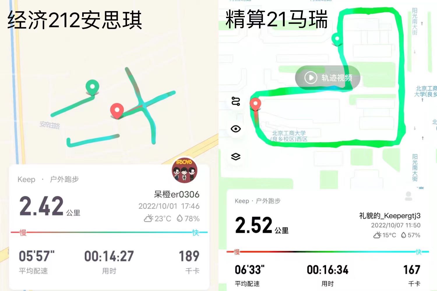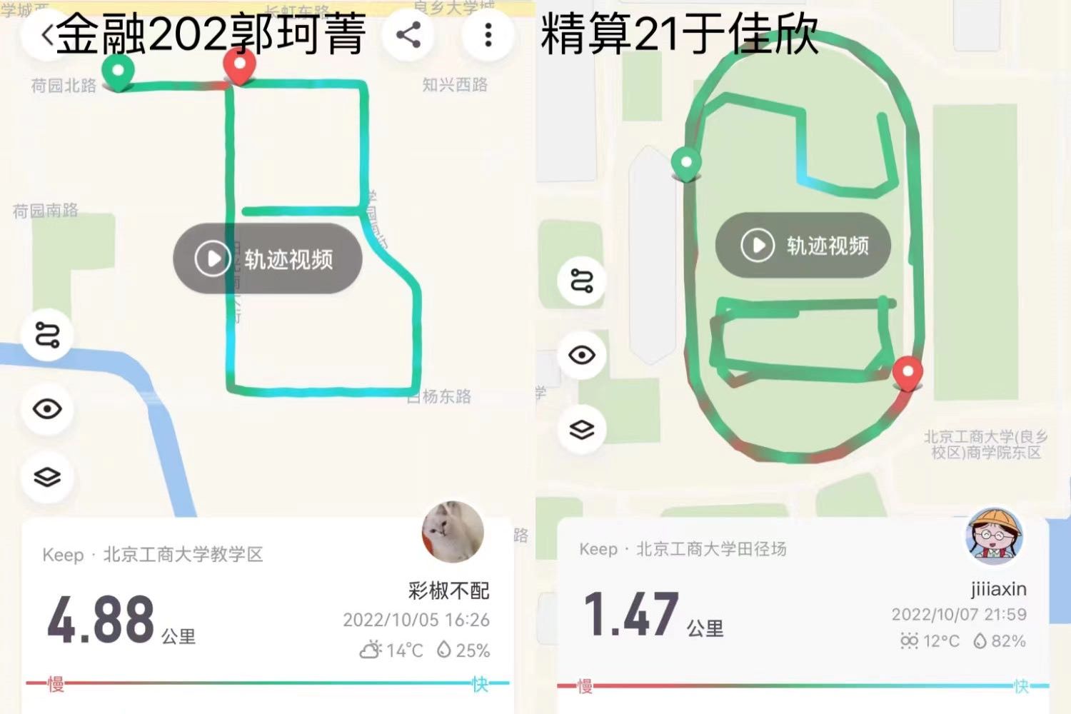 國慶期間,學院開展了“喜迎二十大樂跑向未來”戶外跑步活動,引領全體學生以積極昂揚的姿態和精神面貌慶祝祖國華誕、喜迎黨的二十大的召開。通知一經發出,同學們紛紛積極響應,先后共有 79人參與。活動分為自由跑和花式跑兩個模塊,大家用自己的腳步跑出了 73、20、心型等形狀,表達了學院學子對祖國73華誕和黨的二十大的祝福,并在北京學聯的平臺上向祖國發出了自己的祝福和心聲。學生們矯健的身影充分展現了學院學子的朝氣與活力,弘揚我校“無健康,不工商”的體育精神。