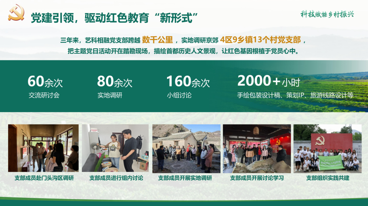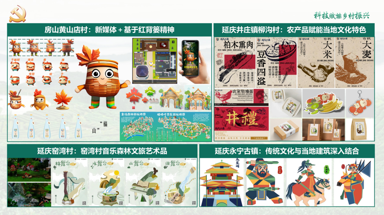 藝科相融黨支部以鄉愁為紐帶,黨建“執筆”,科技賦能鄉村振興。支部聚焦首都科創中心建設,發揮專業特色,扎根京華大地,與北京市房山、門頭溝、延慶、大興區京郊村黨支部開展紅色“1+1”共建,構建“12345N”工作體系,以科技賦能鄉村振興為目標,依托學校兩大研究院,圍繞賦能文旅、激活產業、涵養美感三重向度,從包裝、文化、旅游、品牌四方面入手,依托首都古村落視覺規劃設計虛擬仿真實驗,以品牌IP融合AR交互,為多個鄉村提供數字體驗設計與鄉村振興旅游規劃設計,共繪鄉村“五新”斑斕畫卷。數智賦能,教學相生,師生黨員主持參與鄉村振興相關省部級課題14項,其中國家級3項;支部黨員獲“挑戰杯”文旅專項賽金銀銅獎33項,其中金獎8項。共建事跡多次被寫入教育部簡報,并獲新華網、央視網、人民網等媒體報道。支部學生在支部共建、人才共育、發展共謀中收獲成長,11人畢業后扎根京郊鄉鎮政府,繼續走好設計賦能鄉村振興之路。