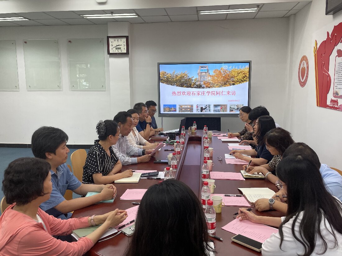鄭文紅代表學校對石家莊學院同仁的來訪表示熱烈歡迎,他介紹了學校歷史沿革、辦學特色、人才培養及發展規劃等情況,對近年來學校在人才培養、學科建設、師資隊伍、科學研究等方面所取得的成績做了詳細說明。他表示,兩校同為地方高校,立足地方、服務地方、爭創一流,在很多領域可以開展合作;特別是在京津冀一體化十周年之際,希望兩校進一步加強交流,在紅色資源共享、優秀生源輸送、圖書館合作共建、創新創業教育等方面,加強協同、共促發展。