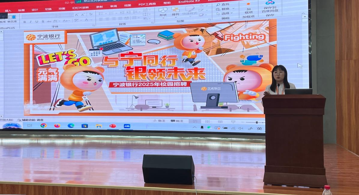 寧波銀行代表和興業銀行代表分別介紹企業概況、招聘崗位和招聘流程等多方面內容,以其各自特色的企業文化和產品特色,結合當下市場的發展趨勢,向同學們全面展示了銀行的品牌價值和金融實力。此外,兩家銀行著重介紹了新員工加入后的職業發展路徑、內部晉升機制等等,充分展現了兩家銀行對于員工能力的成長與團隊融入的高度重視。