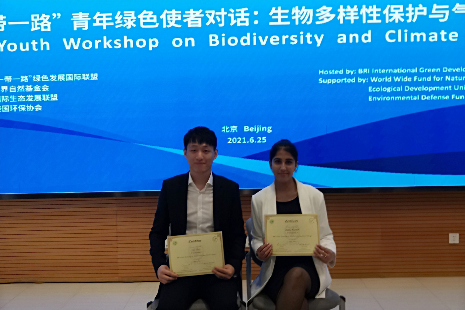 6月25日,“‘一帶一路’青年綠色使者對話:生物多樣性與氣候行動”在京召開。會議由中華人民共和國生態環境部和聯合國環境署共同發起建設的“一帶一路”綠色發展國際聯盟(BRI International Green Development Coalition)主辦,世界自然基金會(World Wide Fund for Nature,WWF),國際生態發展聯盟(Ecological Development Union International,EDUI)和美國環保協會(Environmental Defense Fund,EDF)協辦。生態環境保護領域的專家學者與來自剛果金、泰國、巴基斯坦、德國、比利時和中國等全球數十個國家或地區的青年學子50余人受邀參加了此次會議。我校2020級食品科學與工程博士研究生Madiha Khurshid和應用經濟學博士研究生閆碩參加會議并在會議上發言。