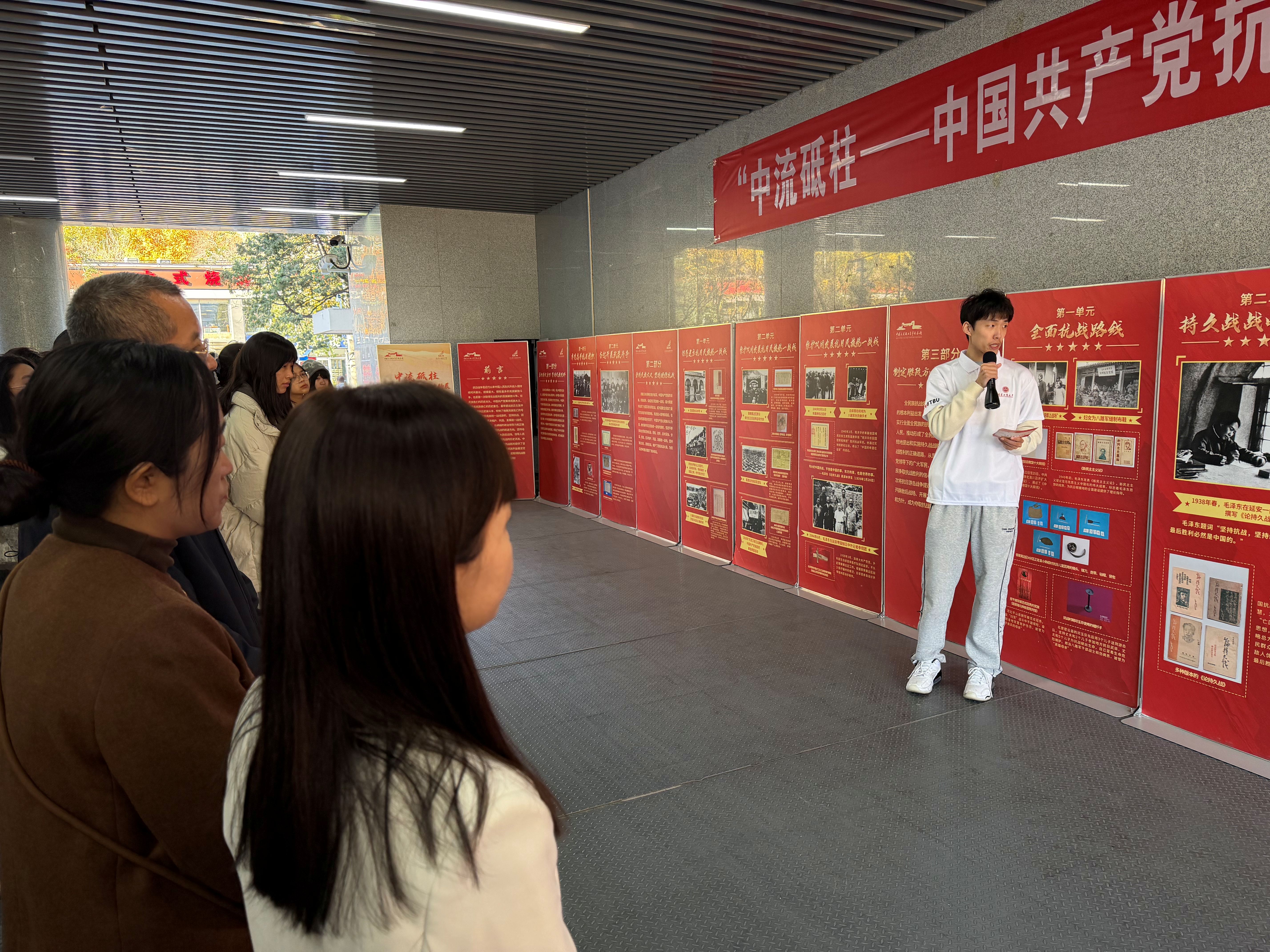 在“中流砥柱——中國共產黨抗戰文物展校園巡展”講解環節,講解員們圍繞精心布置的展品,結合珍貴的歷史圖片和翔實的史料,為師生們詳細介紹了抗戰時期中國共產黨的重要會議、重大決策以及艱苦卓絕的斗爭歷程。從瓦窯堡會議、洛川會議等重要會議的文物,到《對日戰爭宣言》《論持久戰》等文獻,每一件展品都承載著厚重的歷史記憶,訴說著那段波瀾壯闊的歲月。師生們認真聆聽,不時駐足凝視,深刻感悟到中國共產黨在抗戰中的偉大貢獻和偉大精神。