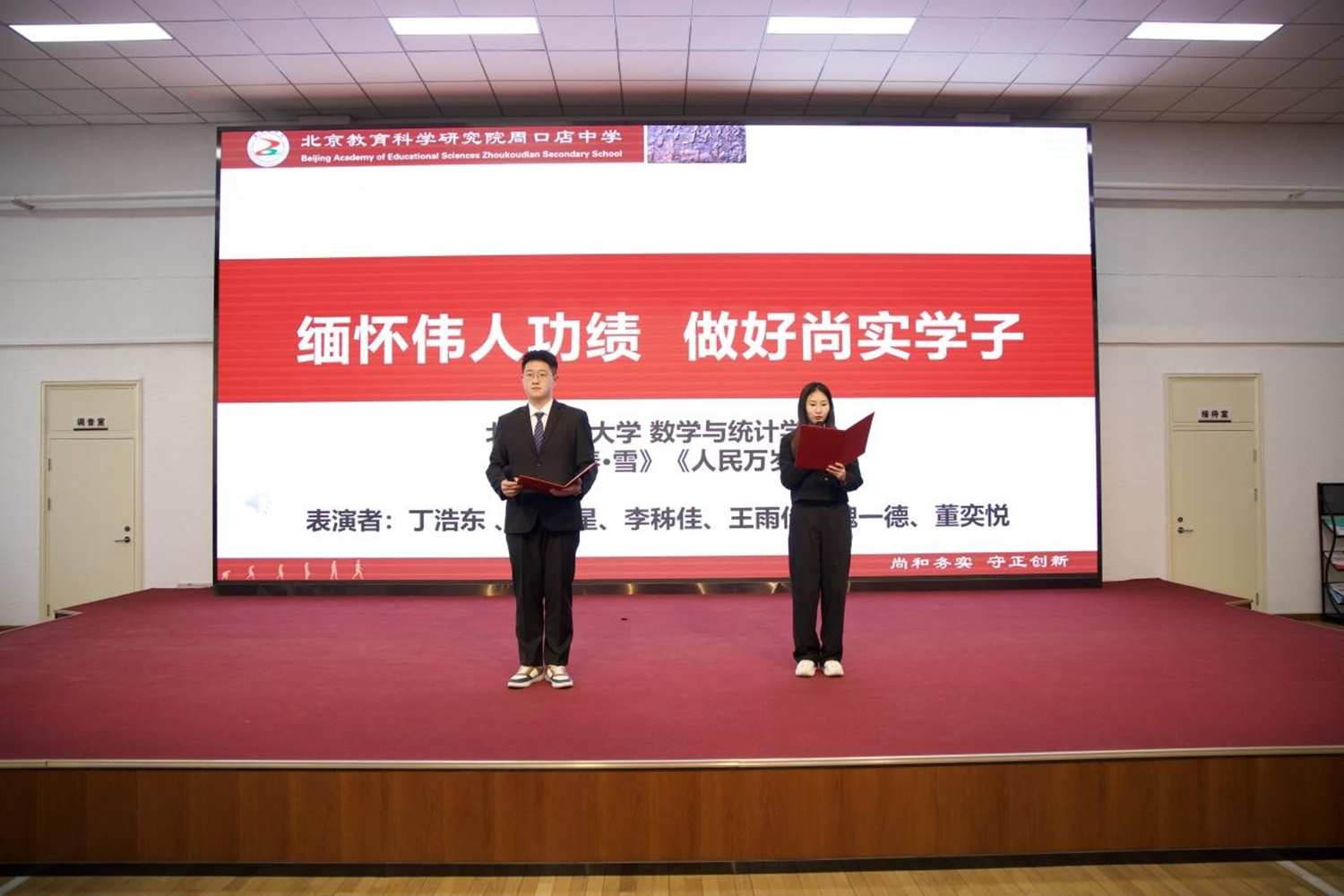 12月25日,北京教科院周口店中學舉辦“緬懷偉人功績,做好尚實學子”紀念毛澤東同志誕辰130周年主題教育,作為紅色“1+1”實踐基地共建方,我校數學與統計學院受邀參加。學院黨委副書記畢平平、團委書記李鑫、專職組織員寇明雯、輔導員曹易人、經統學生第一黨支部書記郭喜辰、新聞中心攝影部部長李瀟逸及參演學生到場,共同緬懷偉人功績,傳承紅色精神。