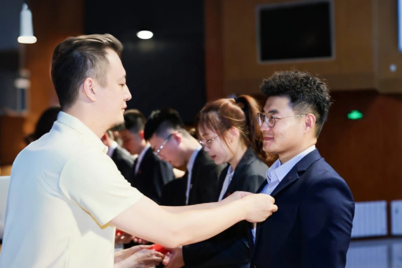 商學院領導為新生代表佩戴院徽,愿每一位新商院學子心中裝滿對國家的深情厚意,接續前輩的奮斗之火,砥礪前行,無畏挑戰,勇攀科學與知識的巍峨高峰。
