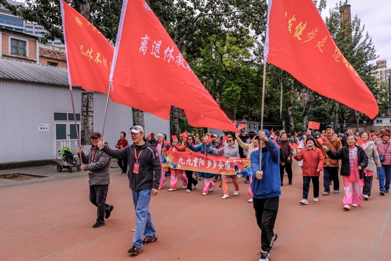 集體健步走成為活動開場的一道亮麗風景線。三名老同志旗手高舉“離退休教職工健走團”“銀發健步走,邁向新征程”“退休不褪色,樂活新時代”的鮮艷旗幟,邁著穩健的步伐走在隊伍前方。沿途播放著《歌唱祖國》《沒有共產黨就沒有新中國》等經典紅歌,熟悉的旋律回蕩在校園,喚起了老同志們的時代記憶。“一二三四!健康加油!”領隊老師夏京春不時帶領大家喊出簡潔有力的健身口令,老同志們齊聲回應,聲音洪亮、精神飽滿,整齊的步伐與嘹亮的口號、激昂的紅歌相互呼應,形成了校園里一道充滿活力的秋日圖景。大家在操場步道有序前行,舒展筋骨的同時,更感受到集體活動的歸屬感與幸福感。