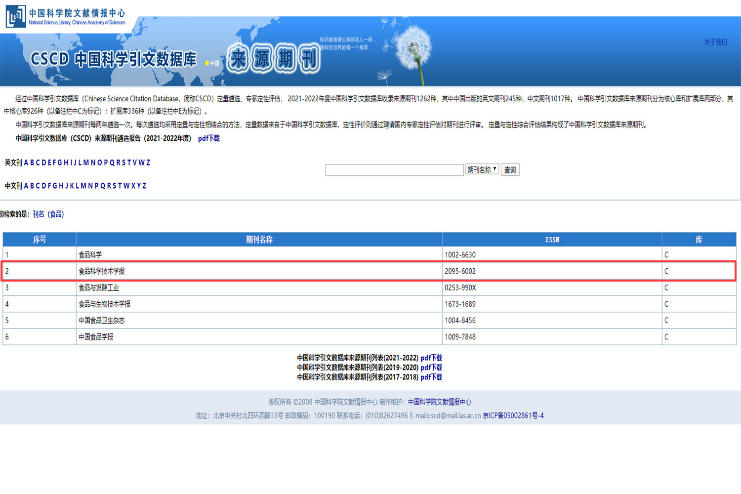 CSCD數(shù)據(jù)庫(kù)由中國(guó)科學(xué)院文獻(xiàn)情報(bào)中心研制,是國(guó)內(nèi)科技期刊的最高級(jí)別評(píng)價(jià)系統(tǒng),被譽(yù)為中國(guó)的SCI。該數(shù)據(jù)庫(kù)每?jī)赡赍噙x一次,2021-2022年度僅收錄中文期刊1017種,其中在51份食品專業(yè)期刊中僅收錄8種。