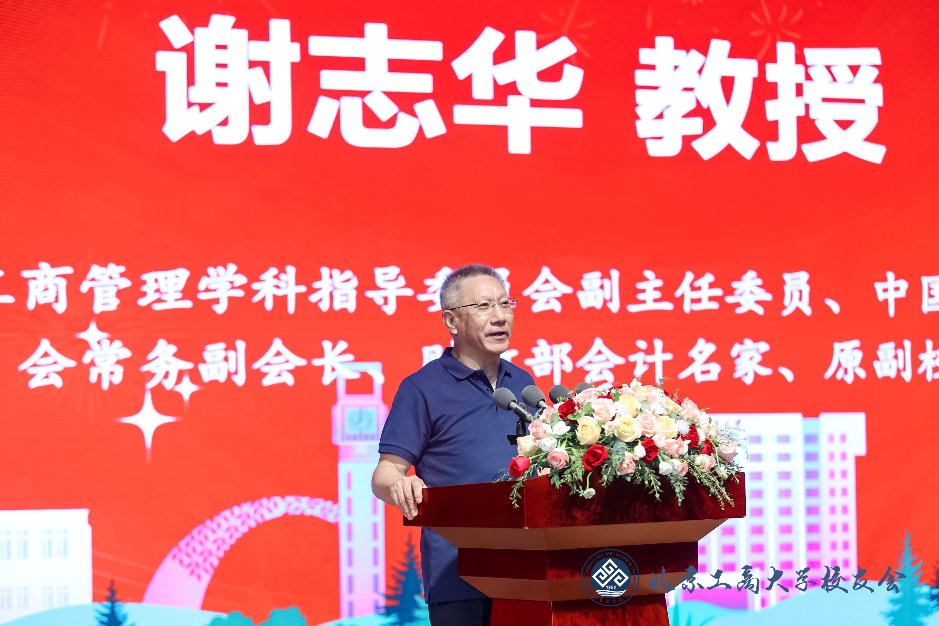 黨委書記黃先開在致辭中代表學(xué)校向廣大校友致以親切的問候和美好的祝愿,向返校校友表示熱烈歡迎,向長期以來關(guān)心、支持學(xué)校建設(shè)與發(fā)展的各界人士和朋友們表示衷心感謝!黃先開介紹了學(xué)校近年發(fā)展取得的成績、兩校區(qū)辦學(xué)定位和未來5年的奮斗目標(biāo)。他指出,北京工商大學(xué)是北京市6所高水平研究型大學(xué)之一,74年來,一代代北工商人傳承紅色基因,躬耕不輟,精業(yè)篤行。教學(xué)科研、學(xué)科建設(shè)、人才培養(yǎng)、辦學(xué)條件等各項(xiàng)事業(yè)蓬勃發(fā)展,辦學(xué)質(zhì)量、綜合實(shí)力和社會美譽(yù)度顯著提升,在商科數(shù)字化轉(zhuǎn)型、科教融合服務(wù)國家和首都發(fā)展戰(zhàn)略等方面做出了積極貢獻(xiàn)。他重點(diǎn)介紹了阜成路校區(qū)服務(wù)北京國際科技創(chuàng)新中心和國際交往中心的功能定位以及未來的發(fā)展思路。