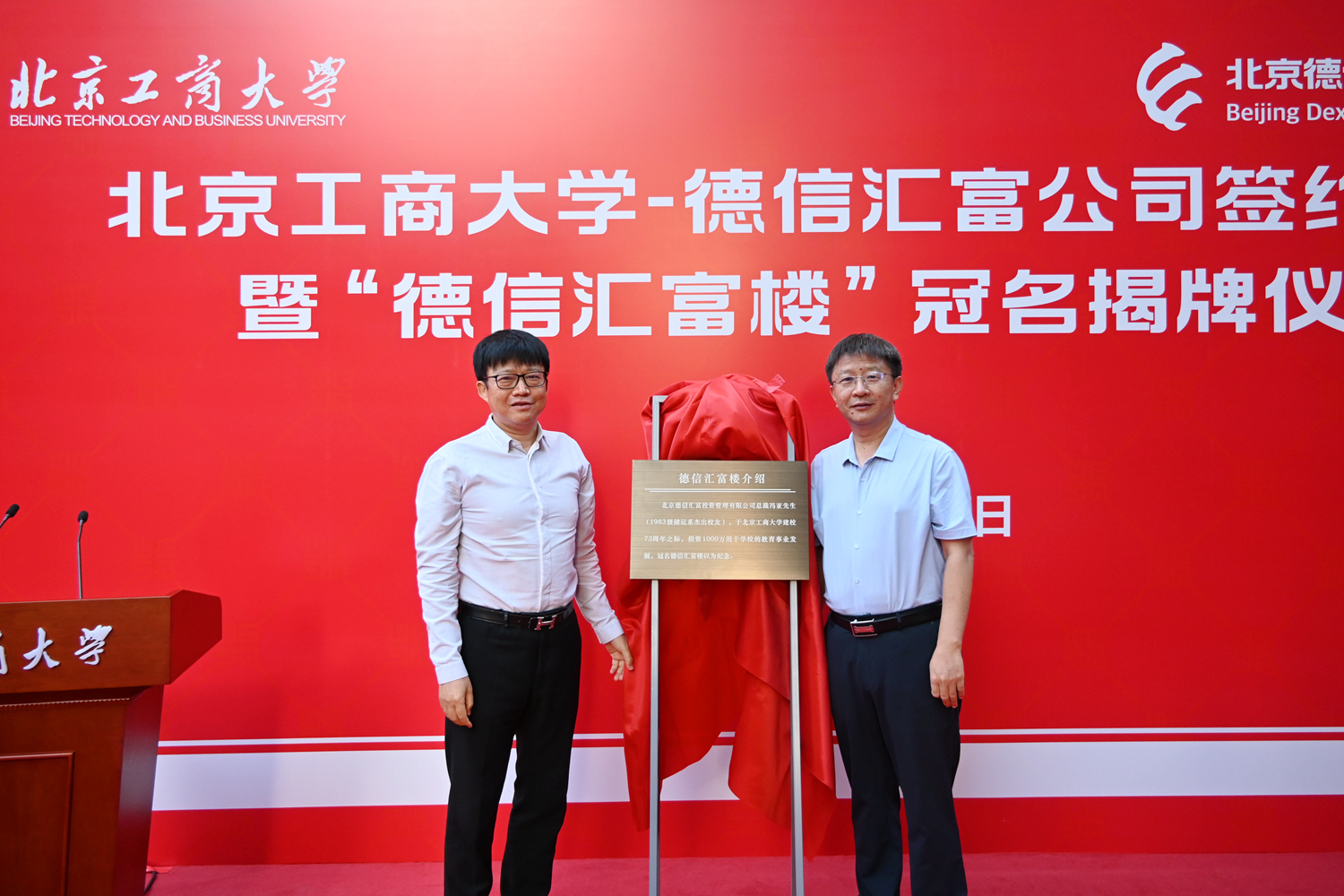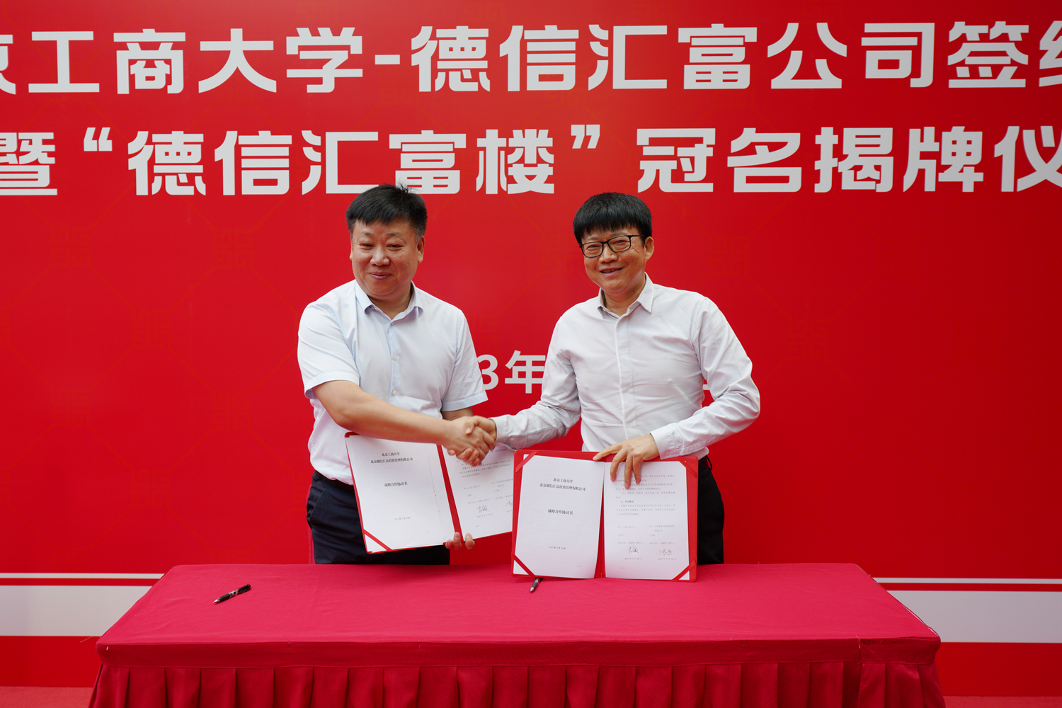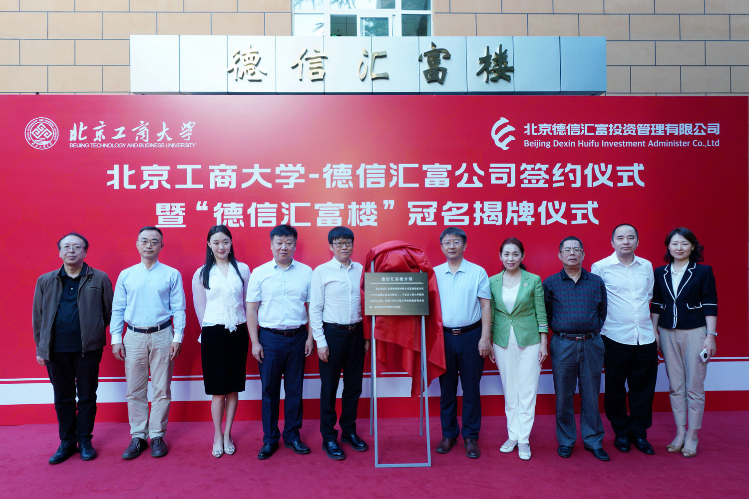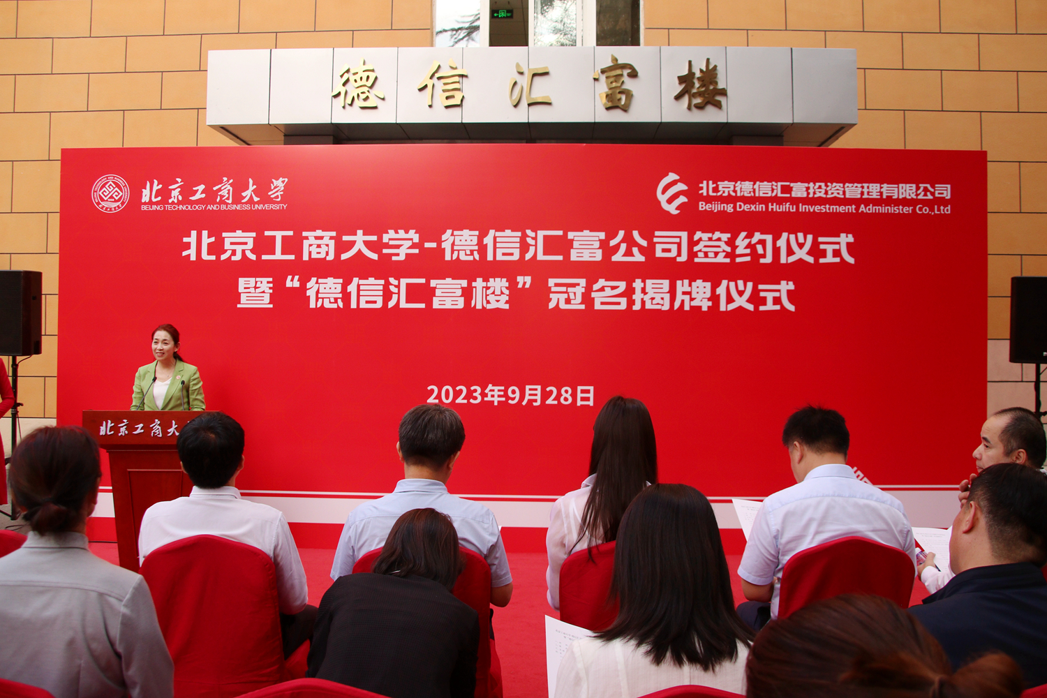 秋高氣爽,佳節將至,9月28日,北京工商大學-德信匯富公司戰略合作簽約儀式暨“德信匯富樓”冠名揭牌儀式在阜成路校區舉行。校黨委副書記、校長郭建華,黨委常委、副校長、教育基金會理事長徐丹丹,黨委常委、副校長、校友會會長左敏,83儲運專業校友、北京德信匯富投資管理有限公司總裁馮亞出席儀式。儀式由徐丹丹主持。