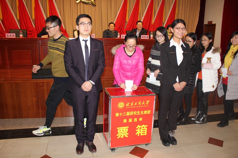會議聽取、審議并表決了《北京工商大學第十二次研究生代表大會代表資格審查報告》、《北京工商大學第十一屆研究生會委員會工作報告》、《北京工商大學第十一屆研究生會委員會經費使用報告》。大會經由第十二屆研究生會主席團候選人競選展示,通過代表無記名投票的方式,差額選舉產生了我校第十二屆研究生會主席團成員。