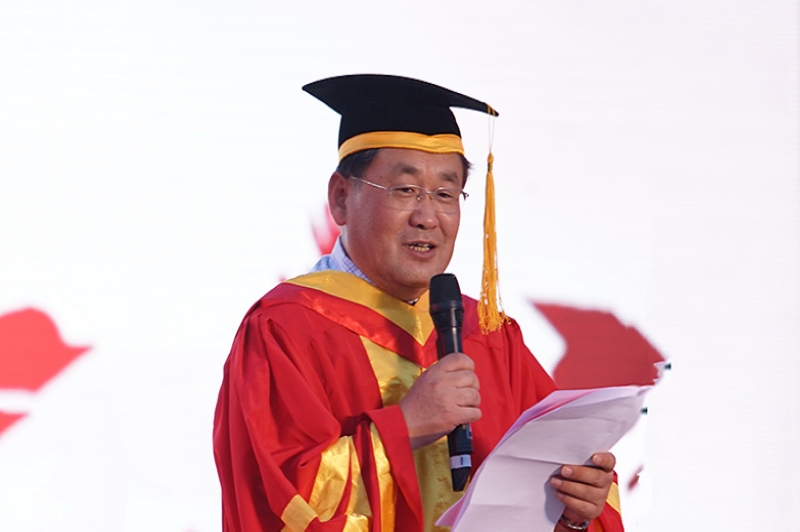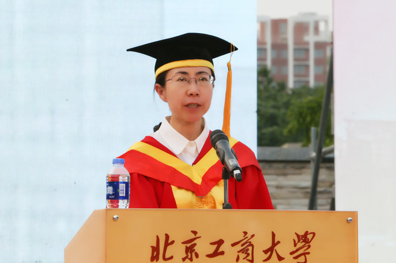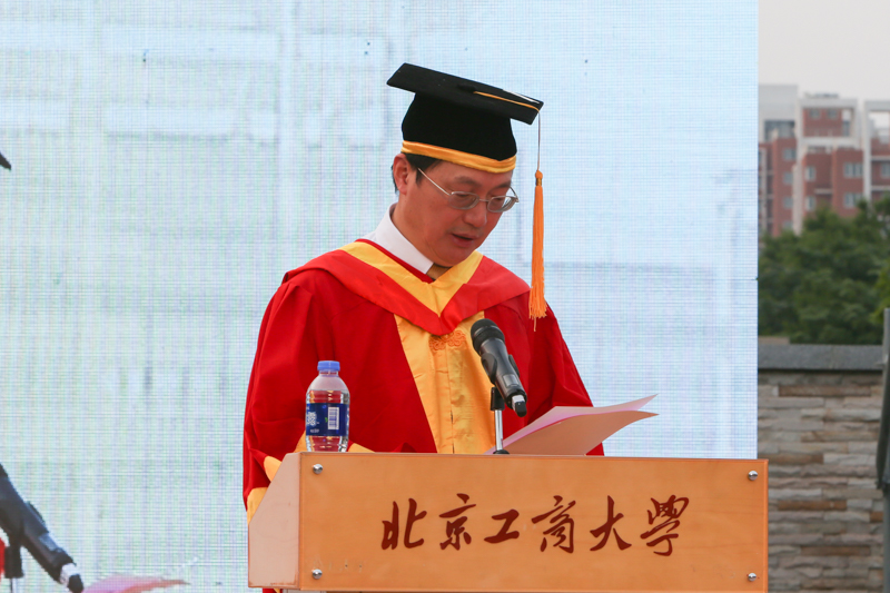 校長(zhǎng)孫寶國(guó)院士在發(fā)言中代表學(xué)校黨政向2017屆畢業(yè)生表示熱烈的祝賀,向?yàn)橥瑢W(xué)們成長(zhǎng)而辛勤耕耘的全體教職員工表示衷心的感謝,向前來(lái)參加畢業(yè)典禮的各位家長(zhǎng)和朋友們表示誠(chéng)摯的歡迎。孫校長(zhǎng)談到,2017屆本科畢業(yè)生是北工商歷史上國(guó)際化基礎(chǔ)最好、能力最高的一屆,是北工商一流大學(xué)征程中具有里程碑意義的一屆,第一次突破了學(xué)校本科人才培養(yǎng)質(zhì)量“369”標(biāo)志性指標(biāo)中 “6” 的指標(biāo);今年考研和出國(guó)深造的學(xué)生數(shù)是學(xué)校歷屆畢業(yè)生中最高的。畢業(yè)生中有28人次獲得國(guó)家獎(jiǎng)學(xué)金,625人次在各類競(jìng)賽中獲得市級(jí)以上榮譽(yù),93人次獲得“校園之星”的榮譽(yù)稱號(hào),24人被評(píng)為“北京市三好學(xué)生”,138人被評(píng)為“北京市優(yōu)秀畢業(yè)生”,32名同學(xué)投筆從戎。孫校長(zhǎng)希望同學(xué)們要有“生當(dāng)為人杰”的志向,努力學(xué)習(xí)和工作;同時(shí)要懷感恩之心,在工作和生活中懂得回報(bào),懂得禮讓,學(xué)會(huì)謙讓,做到忍讓。孫校長(zhǎng)談到,國(guó)家給年青人搭建了廣闊的舞臺(tái),希望大家勇挑重?fù)?dān),施展才華,勇敢追夢(mèng)。最后,孫校長(zhǎng)以一首包含北工商校訓(xùn)的詩(shī)寄語(yǔ)畢業(yè)生“三千學(xué)子踏征程,工商校訓(xùn)伴君行,求真立德修心性,勤奮創(chuàng)新建奇功”,希望2017屆學(xué)子在新的崗位奮發(fā)向上,建功立業(yè),創(chuàng)造新的輝煌,成為北工商的驕傲!