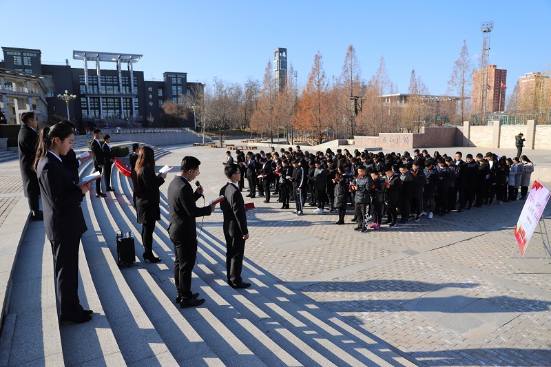 12月4日,學院17級全體同學在求知廣場開展憲法宣誓儀式。冷冽的寒風中,莊嚴的國旗下,全體同學手拿憲法誦讀讀本,重溫憲法精神。儀式開始,全體面向國旗,領誓人左手撫按憲法,右手舉拳,宣讀誓詞。宣誓人列隊站立,左手握著憲法朗誦讀本,舉起右拳,跟誦誓詞。憲法儀式勉勵大家要牢固樹立憲法意識、堅定法治信仰,履行誓言,忠于憲法,奮發學習,做有信仰的法律人,奮力書寫依法治國的新篇章!