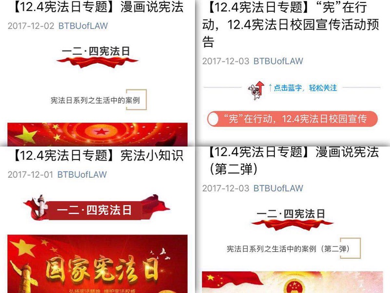 學院利用新媒體進行一系列關于憲法日的推送,通過專題的形式將憲法日的由來、發展,以及憲法知識等進行推送宣傳,通過多媒體渠道,深入學習宣傳黨的十九大精神,宣傳習近平總書記在會上的重要講話精神,宣傳科學立法、嚴格執法、公正司法、全民守法和黨內法規建設的生動實踐。