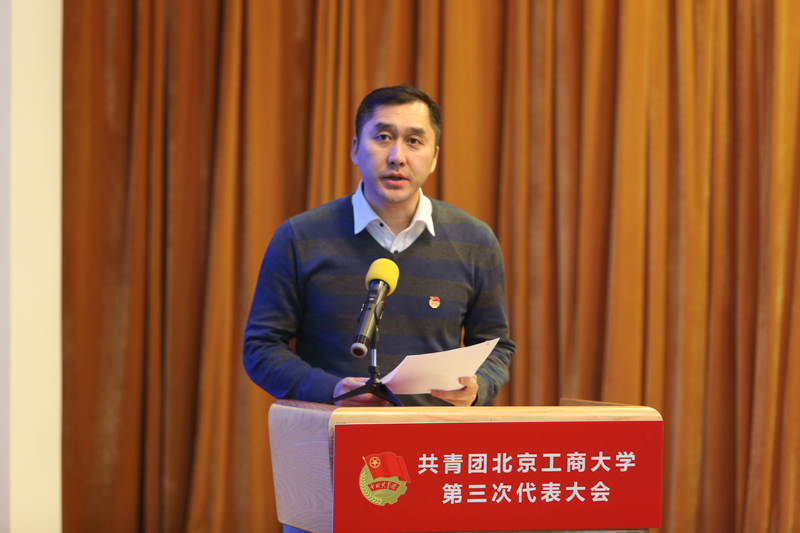 團市委副書記李健代表共青團北京市委員會對大會的召開表示熱烈祝賀,并充分肯定了學校在第二次團代會召開以來各項工作所取得的成績。他希望學校各級共青團組織要認真學習宣傳貫徹黨的十九大精神,在學懂弄通上下功夫;深入貫徹落實中央和北京市共青團改革的各項任務,大力推進從嚴治團;堅持以圍繞中心服務大局為主線,為建設國際一流的和諧宜居之都做貢獻。并希望即將選舉產生的共青團北京工商大學第三屆委員會一定要在黨的十九大精神引領下,在學校黨委和團市委的堅強領導下,在各級團干部和廣大團員青年的一致努力下,銳意進取,埋頭苦干,乘勢而上,為決勝全面建成小康社會、奪取新時代中國特色社會主義偉大勝利、實現中華民族偉大復興的中國夢貢獻青春智慧和力量!