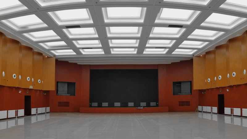 突出細(xì)節(jié)設(shè)計(jì),保證美觀實(shí)用。將原舞臺(tái)高度由900mm將低至600mm,保證臺(tái)上臺(tái)下通行的便利性及安全性,提升前排觀眾的可視范圍及觀演舒適度;采用學(xué)校LOGO元素,設(shè)計(jì)禮堂內(nèi)部裝飾線條,在提升觀眾廳吸音板墻面層次感的同時(shí),彰顯校園文化。