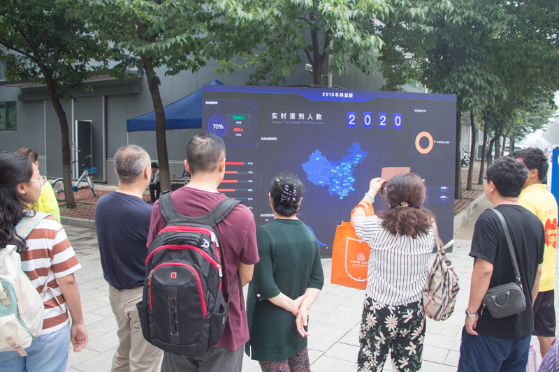 報到現場,實時反映迎新工作數據的藍色電子屏引來新生和家長們駐足。這是學生處首次嘗試全程采用電子大屏“直播”新生報到的情況,通過電子大屏,大家可以隨時了解到學校和各學院新生報到注冊人數以及各時段新生報到情況,充分體現了大數據時代的服務升級。