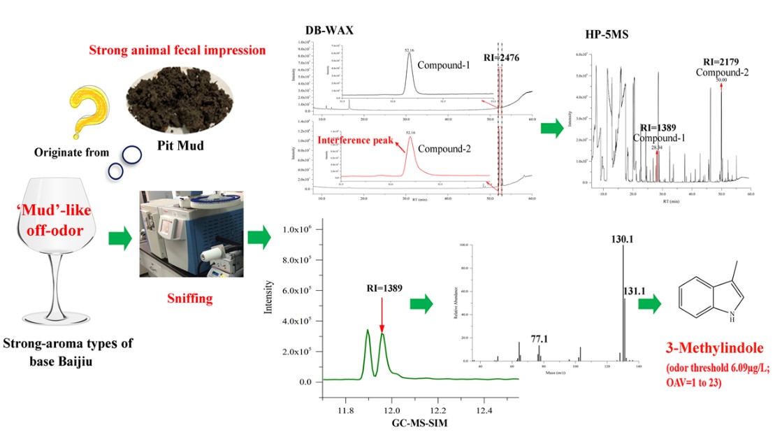 該研究以窖泥泥味明顯的濃香型白酒為研究對象,綜合LLE/SPME-GC-O-MS、GC-MS、雙柱定性等多種手段,解決油酸乙酯作為共流出化合物的干擾,首次在白酒中發現一種具有馬廄味、糞臭味的化合物3-甲基吲哚;結合感官評價(閾值測定、OAV、香氣添加實驗)及統計分析結果,驗證了該化合物為濃香型原漿酒泥臭味的關鍵化合物。該研究進一步闡明了構成濃香型白酒“泥臭”風味特征的化學物質,具有原創性,獲得了匿名審稿專家的充分肯定。同時此研究為提高濃香型白酒品質提供了新的努力方向,具有較高的理論意義和實用價值。