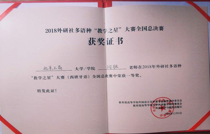 12月8日至9日, 2018外研社多語種“教學(xué)之星”大賽全國總決賽在京舉辦,我校外國語學(xué)院西班牙語教師閆欣代表我校參賽,榮獲全國總決賽一等獎(jiǎng)。