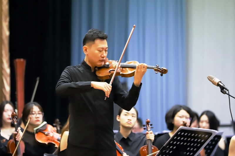 音樂會在莊嚴雄壯的《義勇軍進行曲》中拉開帷幕。中央音樂學院指揮系林濤教授帶領中央音樂學院百余名師生演繹了一場高水平的視聽盛宴。演奏的曲目既有《紅旗頌》、《白毛女》組曲、琵琶協奏曲《草原英雄小姐妹》、《紅色娘子軍》組曲等各個時期膾炙人口的紅色曲目,又有青年男女高音歌唱家演唱的《初心不改》、《我愛你中國》、《我和我的祖國》等愛國歌曲。柴可夫斯基國際音樂大賽歷史上最年輕的小提琴首獎獲得者陳曦用一首小提琴協奏曲《梁祝》為觀眾講述了一個婉轉動人的愛情故事,或舒緩或疾馳的演奏給同學們帶來了藝術美的享受。最后,全場千余名師生起立,齊聲高唱《歌唱祖國》,將整臺音樂會推向高潮。音樂會在熱烈的掌聲中和意猶未盡中落下帷幕。
