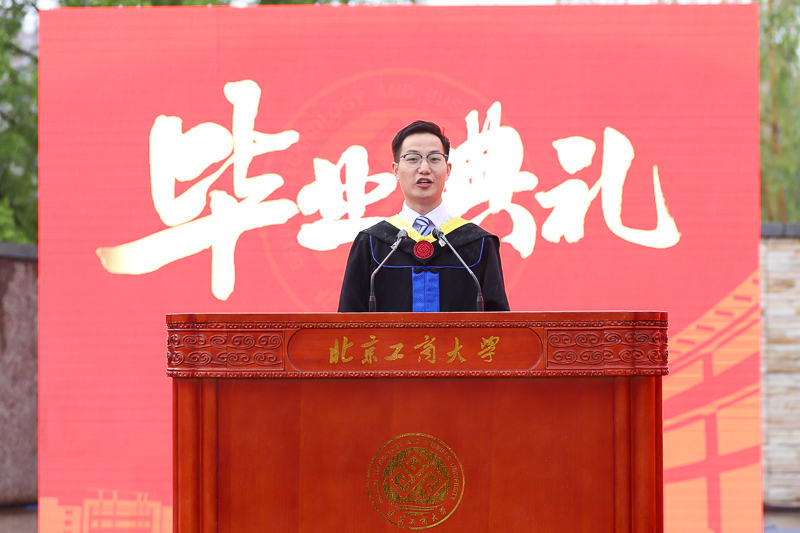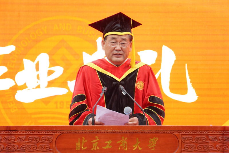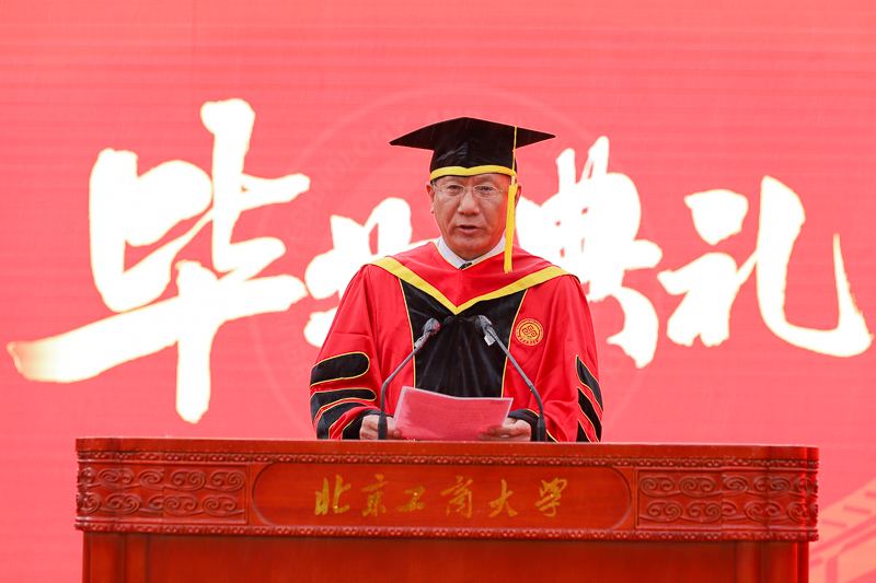 孫校長寄語即將離開母校、開啟新征程的畢業(yè)生們:第一,要永葆感恩之心。要感謝父母的養(yǎng)育之恩、老師的教育之恩、學(xué)校的培養(yǎng)之恩。只要時刻都擁有一顆感恩的心,工作就會充滿激情,生活就會充滿歡樂,事業(yè)就會走向成功。他希望畢業(yè)生們傳承北工商人感恩的傳統(tǒng),關(guān)心支持母校發(fā)展。第二,要永葆責(zé)任之心。同學(xué)們走出校門將面臨前所未有的困難和挑戰(zhàn),要肩負(fù)起工作的責(zé)任、家庭的責(zé)任、社會的責(zé)任,肩負(fù)起時代賦予的中華民族偉大復(fù)興的歷史使命;要記住責(zé)任有多大,事業(yè)就有多大,要敢于負(fù)責(zé),善于負(fù)責(zé),干大事,擔(dān)大責(zé)。第三,要永葆奮進(jìn)之心。中華民族今天的成就是先輩用鮮血、汗水和智慧奮斗出來的。習(xí)近平總書記在“五四”100周年大會上講到:“一代人有一代人的長征,一代人有一代人的擔(dān)當(dāng)。”國家民族需要同學(xué)們這一代在經(jīng)濟(jì)、社會、科技等各個領(lǐng)域百尺竿頭、更進(jìn)一步,要具有“當(dāng)今之世,舍我其誰”的氣概,砥礪意志、腳踏實(shí)地、奮勇前行、履職盡責(zé),用當(dāng)下去書寫未來,用奮斗迎接美好的人生,中華民族偉大復(fù)興的中國夢將會在你們這代人的奮斗下夢想成真。孫校長表示,母校將一如既往地關(guān)心、關(guān)注和支持同學(xué)們的發(fā)展,北工商永遠(yuǎn)是大家的堅(jiān)強(qiáng)后盾和精神家園。他希望同學(xué)們在展翅高飛的同時,常回家看看,與母校分享成功的喜悅、分擔(dān)失敗的痛苦,并相約三十年后與同學(xué)們一同參加母校的百年慶典。