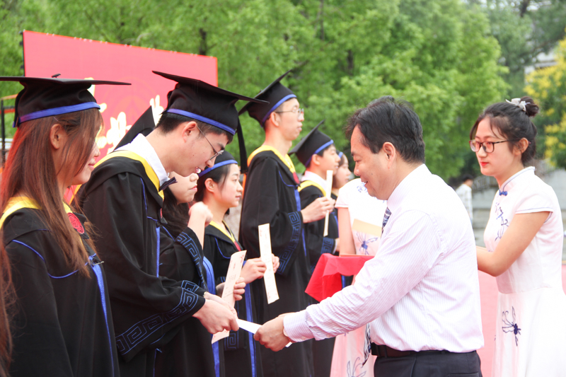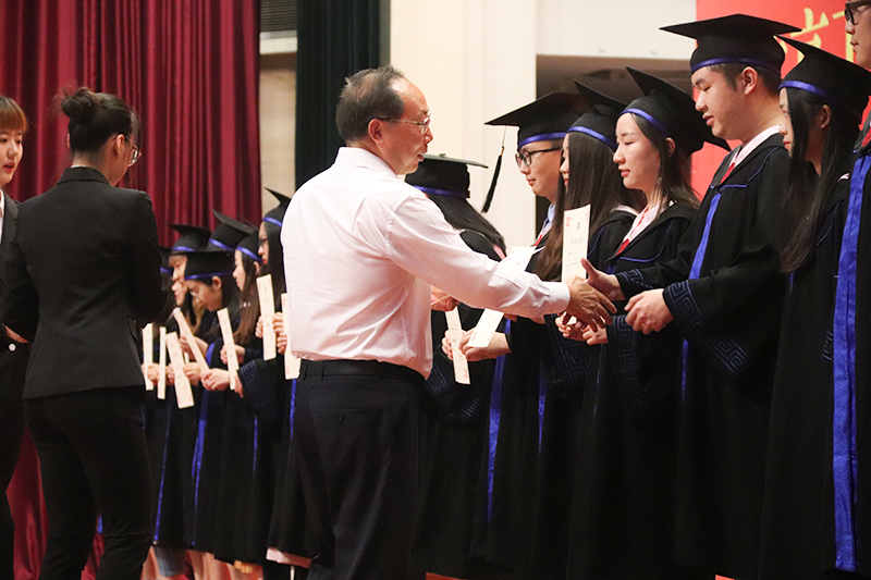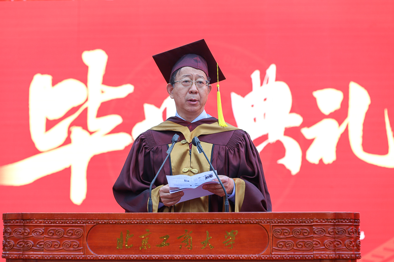 校長孫寶國院士在講話中代表學(xué)校向2019屆本科畢業(yè)生表示最熱烈的祝賀。孫校長談到,2019屆學(xué)生是學(xué)校進(jìn)一步深化本科教學(xué)綜合改革的第一屆,四年間學(xué)校出臺了一系列措施幫助同學(xué)們成長成才:配備了副教授以上職稱的優(yōu)秀教師擔(dān)任班主任,實(shí)施了英語分十級教學(xué),實(shí)行了“千人大考”,開展了“五早一晚”晨讀晨練活動。經(jīng)過師生四年的努力,2019屆本科畢業(yè)生深造率達(dá)到30.19%,首次實(shí)現(xiàn)了學(xué)校本科人才培養(yǎng)“369”指標(biāo)中“3”的突破。2019屆畢業(yè)生中共有24人次獲得國家獎學(xué)金、24人被評為“北京市三好學(xué)生”、133人被評為“北京市優(yōu)秀畢業(yè)生”、131人次獲得“校園之星”榮譽(yù)稱號;764人次在市級、國家級、國際級的競賽中獲獎,其中有62項(xiàng)一等獎。四年中,同學(xué)們積極參與大學(xué)生社會實(shí)踐活動,熱心公益,勇于擔(dān)當(dāng)社會責(zé)任,志愿服務(wù)時長28萬多小時,獲得了48項(xiàng)市級以上榮譽(yù)。四年中,同學(xué)們通過參加 “五早一晚”、“陽光長跑”、體育文化節(jié)、各類體育聯(lián)賽和運(yùn)動會活動,堅(jiān)持體育鍛煉,有69個團(tuán)體289人次在市級以上體育文藝競賽中獲獎,其中在首都高等學(xué)校第十屆秋季田徑運(yùn)動會上還打破了4x100女子組的記錄。孫校長指出,一分耕耘一分收獲,學(xué)校近年來人才培養(yǎng)質(zhì)量的不斷提升是全校師生共同奮斗的結(jié)果,其中我校位列中國教育在線公布的2018年中國大學(xué)生畢業(yè)薪酬水平排行榜57位,在武書連2019中國大學(xué)生新生質(zhì)量與畢業(yè)生質(zhì)量對照排行榜中,通過4年培養(yǎng),我校畢業(yè)生全國排名提升了8位。孫校長談到,為了表達(dá)對同學(xué)們的祝賀與祝福,學(xué)校決定將首次專門設(shè)計(jì)制作的學(xué)位服送給畢業(yè)生們作為紀(jì)念。