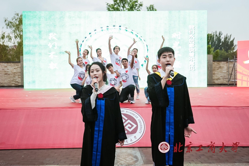 開場前,畢業(yè)生代表現(xiàn)場演唱了感人至深的歌曲,播放了由學(xué)生處、黨委宣傳部聯(lián)合制作的開場視頻,此刻畢業(yè)生們臉上已分不清雨水還是感動的淚水。典禮現(xiàn)場,盡管雨一直下,但感動的氛圍越來越濃,五顏六色的雨傘成為一道獨(dú)特的風(fēng)景線。值得一提的是,學(xué)校今年首次專門設(shè)計(jì)制作了專屬于北工商學(xué)子的學(xué)士服,希望畢業(yè)生們身著屬于自己的學(xué)士服,留下最美好的身影和最難忘的青春記憶。