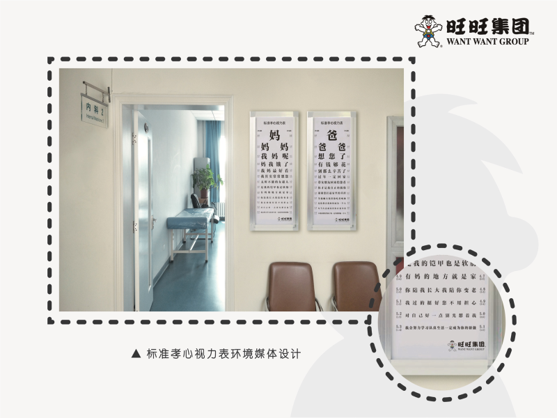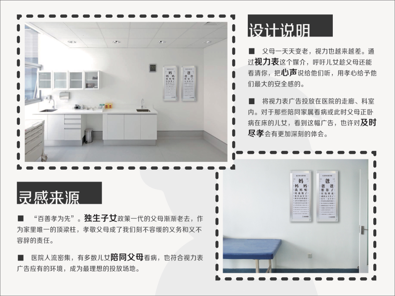 高伊茗同學的作品《標準孝心視力表》將視力表圖形內容替換為對父母想說的心里話,巧妙地將視力表元素進行了創新應用,并借用視力表這一環境媒體,將其投放至醫院走廊、科室內等公共場所,表達了盡孝要及時的核心概念,呼吁兒女趁父母還能看清你,把心聲說給他們聽,用孝心給予他們最大的安全感,同時希望那些陪同家屬看病或此時父母正臥病在床的兒女們看到這幅廣告,能夠對及時盡孝有更加深刻的體會。