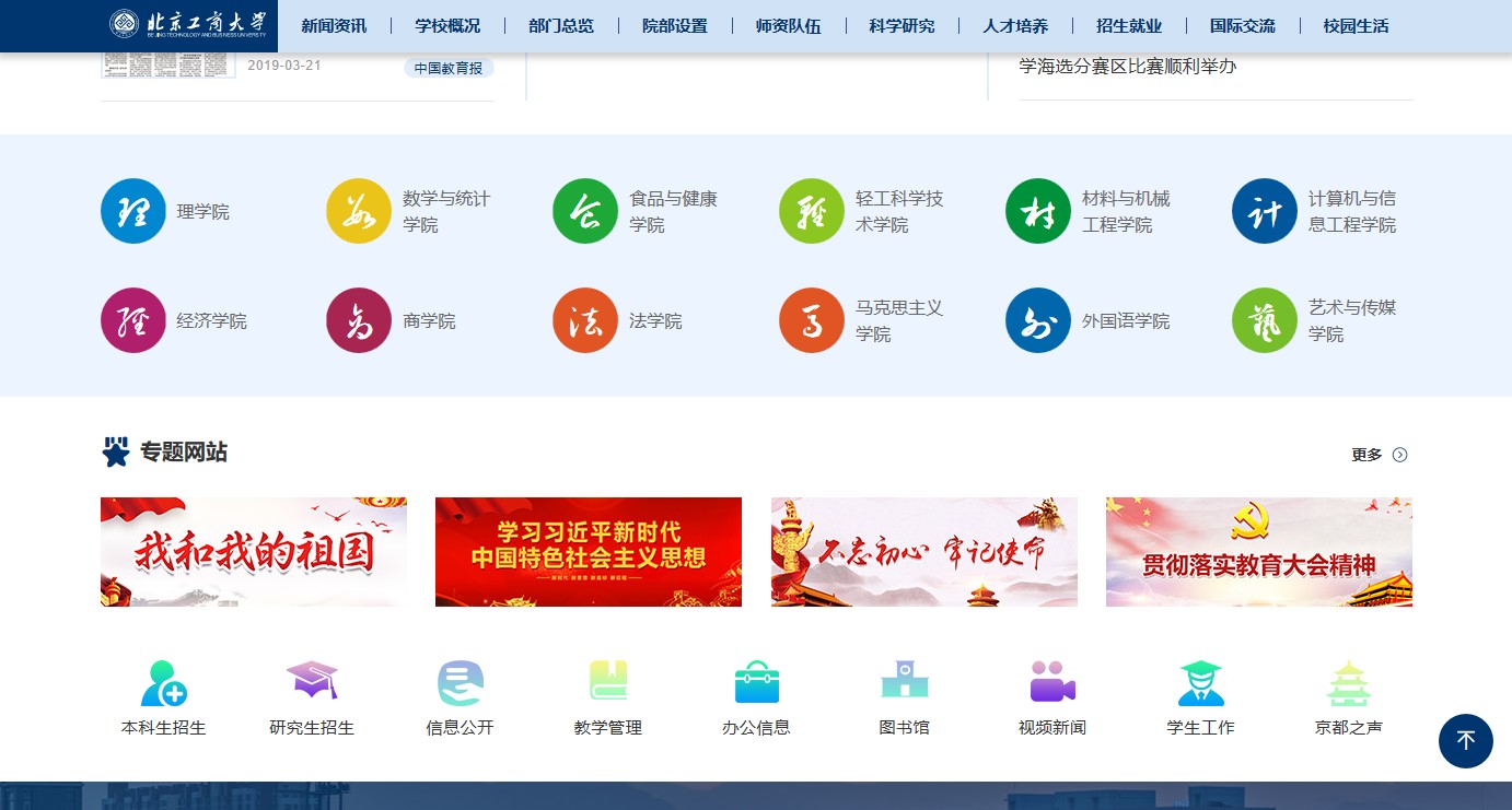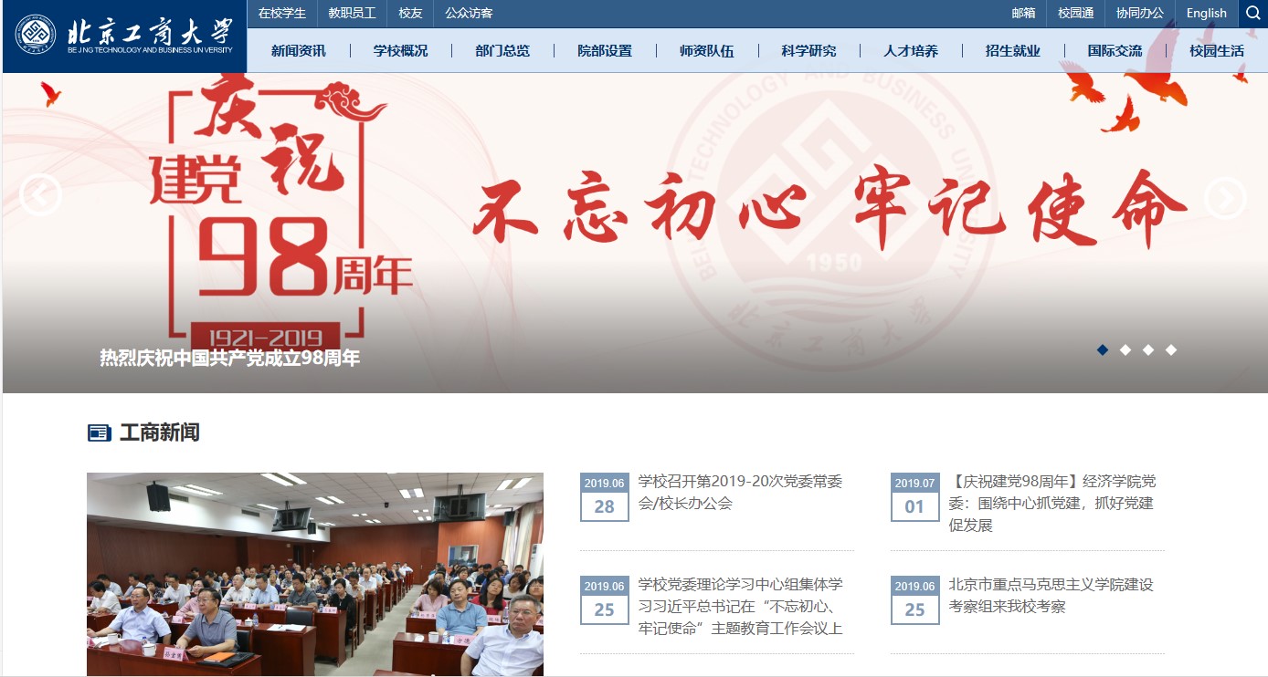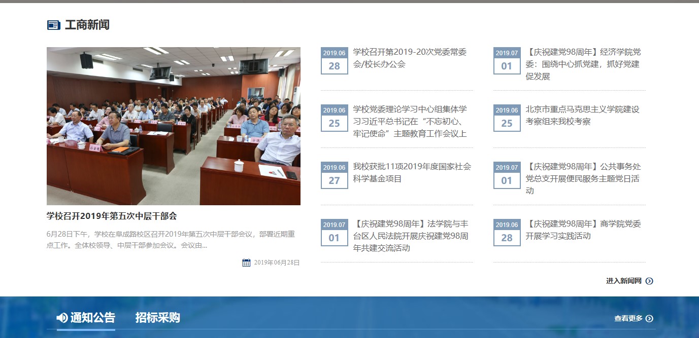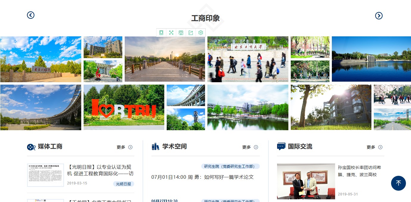 改版前對(duì)原版校園網(wǎng)進(jìn)行了梳理分析,調(diào)研、參考了80多家國(guó)內(nèi)外高校校園網(wǎng)的版面設(shè)計(jì)、欄目設(shè)置和頁(yè)面內(nèi)容,進(jìn)一步明確了校園網(wǎng)的功能、定位。新版校園網(wǎng)立足對(duì)外展示形象、對(duì)內(nèi)服務(wù)師生,力求通過(guò)改版,以達(dá)到使用更便捷、架構(gòu)更清晰、頁(yè)面更時(shí)尚的改版目標(biāo),進(jìn)一步服務(wù)學(xué)校中心工作和師生需求。新版主頁(yè)以工商藍(lán)為主色調(diào),采用寬幅版式,構(gòu)圖具有鮮明的視覺(jué)沖擊效果。新版網(wǎng)頁(yè)主要變化有:第一,更新主頁(yè)面的結(jié)構(gòu),采用扁平化首頁(yè)高清主題圖片滾動(dòng)展示重要節(jié)點(diǎn)、學(xué)校重要新聞事件、校園風(fēng)景等內(nèi)容,增加“工商印象”版塊,用大篇幅圖片展現(xiàn)學(xué)校優(yōu)美風(fēng)景,提升首頁(yè)整體美觀度,同時(shí),將頁(yè)面增加至5.5屏,增加了信息的顯示量。第二,優(yōu)化欄目設(shè)置與欄目顯示。為增強(qiáng)新聞可讀性,改變綜合新聞簡(jiǎn)單標(biāo)題的陳列方式,改為1篇帶圖新聞、8篇新聞標(biāo)題陳列方式,形式更美觀、更清晰;為展現(xiàn)我校國(guó)際化成果,提升學(xué)校國(guó)際化水平,增加了“國(guó)際交流的版塊;為方便師生讀取信息,在“通知公告”“學(xué)術(shù)空間”“招標(biāo)采購(gòu)”欄目中增加來(lái)源部門及發(fā)布時(shí)間顯示;在首頁(yè)顯示各學(xué)院,使用戶可以通過(guò)首頁(yè)直達(dá)學(xué)院網(wǎng)站等。