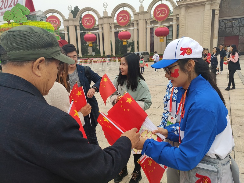 10月19日,在北京展覽館廣場上進行了“我和我的祖國”快閃活動,我校志愿者參與其中,為現場參觀游客發放小國旗,志愿者們飽含熱情,帶動現場氣氛,引導現場觀眾融入快閃活動中來??吹秸麄€廣場沉浸在一篇為祖國歡呼的海洋中,志愿者感慨紛紛被現場濃厚的愛國氣氛感動,能為參加本次志愿服務,參與到慶祝祖國70周年生日的活動感到榮幸和自豪。