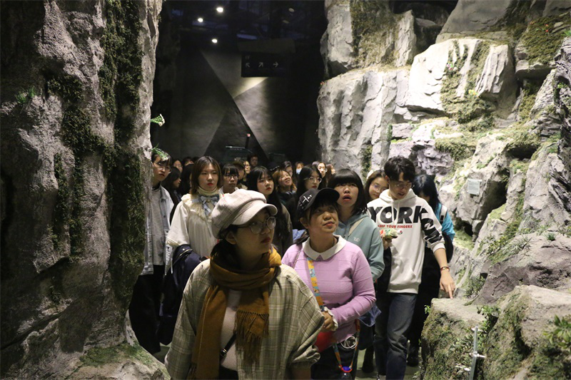 藝術(shù)與傳媒學(xué)院300余名大一新生前往房山世界地質(zhì)公園博物館參觀學(xué)習(xí)。在講解員的指引下,工保輔導(dǎo)員鄒萍萍和同學(xué)們從“時(shí)光隧道”開始了參觀。同學(xué)們以歷史發(fā)展為脈絡(luò),一步步了解地球地質(zhì)的演化過程。通過地質(zhì)巖石模型,同學(xué)們?cè)敿?xì)了解了巖石的形成過程及內(nèi)部構(gòu)造。原景復(fù)刻的“一線天”、鐘乳石溶洞等典型的地質(zhì)景觀,吸引不少同學(xué)駐足觀看學(xué)習(xí)。“地球從遠(yuǎn)古走來”的遼寧專題化石展也吸引了不少同學(xué)眼球,開拓了同學(xué)們的視野。