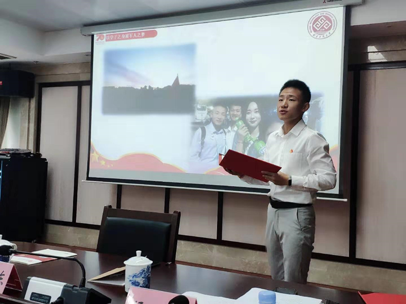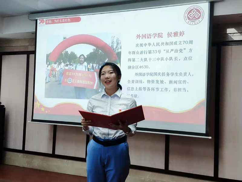 我校經(jīng)濟(jì)學(xué)院退伍大學(xué)生士兵,金融172班王巡東同學(xué),結(jié)合自己攜筆從戎的經(jīng)歷,從擔(dān)任國慶方陣中隊長的角度,介紹了北工商老兵的責(zé)任和擔(dān)當(dāng),通過鏗鏘有力的宣講,把訓(xùn)練中如何克服“體能關(guān)”“蚊蟲關(guān)”“等待關(guān)”講生動、講明白,凸顯了北工商學(xué)子心向黨,青春無悔獻(xiàn)祖國的愛國情懷。商學(xué)院輔導(dǎo)員李雨晴,從帶隊輔導(dǎo)員的角度,介紹了輔導(dǎo)員群體在國慶任務(wù)中身在一線,敢于擔(dān)當(dāng)、甘于奉獻(xiàn)的感人事跡。她以自己和祖輩、父輩,三代人與國慶游行的故事作為切入點,結(jié)合我校一線帶隊老師的諸多感人事跡,把通過國家重大活動進(jìn)行思政教育的感悟娓娓道來,詮釋了“立德樹人”的生動內(nèi)涵,表明了輔導(dǎo)員與青春作伴攜手前行的決心。來自學(xué)工部的楊帥,從服務(wù)保障的角度,對那些為國慶默默奉獻(xiàn),卻不能親自走上長安街的人物、事跡進(jìn)行了介紹,闡述了作為共產(chǎn)黨員克服困難,牢記“四個意識”要求的所思所想、所作所為,著重說明了我校黨員師生上下一心、全力以赴保障國慶任務(wù)的事跡,表達(dá)了代表全國九千萬黨員接受祖國和人民檢閱的豪邁情懷。外國語學(xué)院英語162班侯雅婷,作為參訓(xùn)隊員代表,講述了參與國慶任務(wù)的心路歷程,把北工商學(xué)子在國慶任務(wù)中主動將小我融入大我,自覺服從組織安排,以國家利益為重的良好精神風(fēng)貌進(jìn)行了詳細(xì)闡釋,就“青春為什么是紅色”這個問題進(jìn)行了精彩回答。