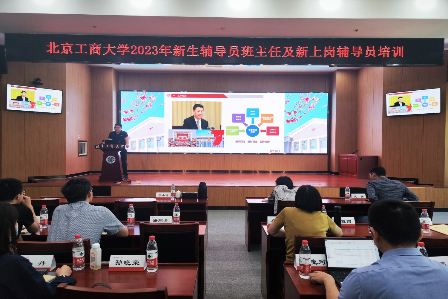 8月31日,學校2023年新生班主任輔導員培訓在阜成路校區舉辦。本次培訓內容涵蓋學工隊伍落實立德樹人的使命擔當、優秀班主任工作經驗分享、大學生心理健康教育、意識形態工作與輿情應對、階梯式思想政治教育及迎新工作安排等,來自各學院的130余名新生班主任、輔導員,以及2023年新上崗的輔導員參加培訓,會議由學生處處長呂良主持。