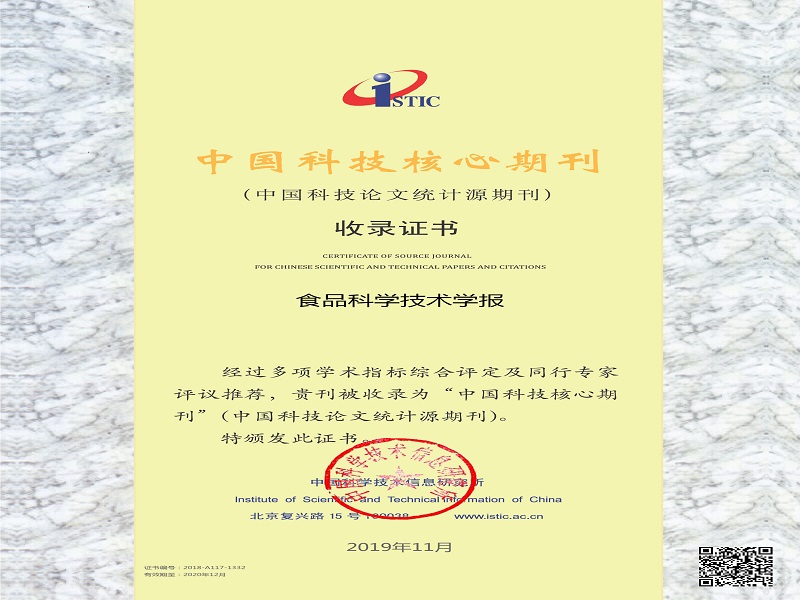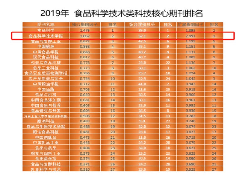 近日,科技部中國科學技術信息研究所發布了2019年版《中國科技期刊引證報告》,我校《食品科學技術學報》各項評價指標再創新高。在51份食品專業期刊中,核心影響因子由去年的第4名上升至第2名,擴展影響因子連續5年保持第1名,綜合得分保持第2名,其他各項指標穩居國內食品科學技術類期刊前列。這是繼今年4月底,《食品科學技術學報》成功入選《中國科學引文數據庫》(CSCD)后,刊物工作取得的又一重要進展,標志著我校刊物已步入國內一流科技期刊行列。