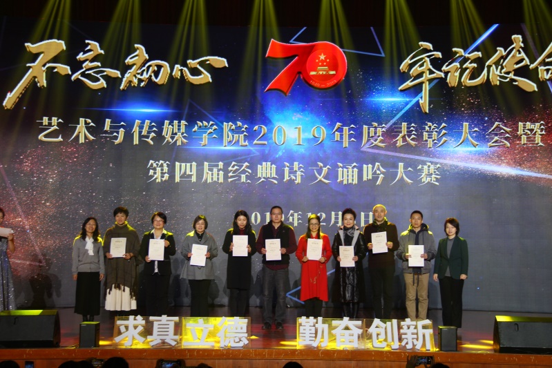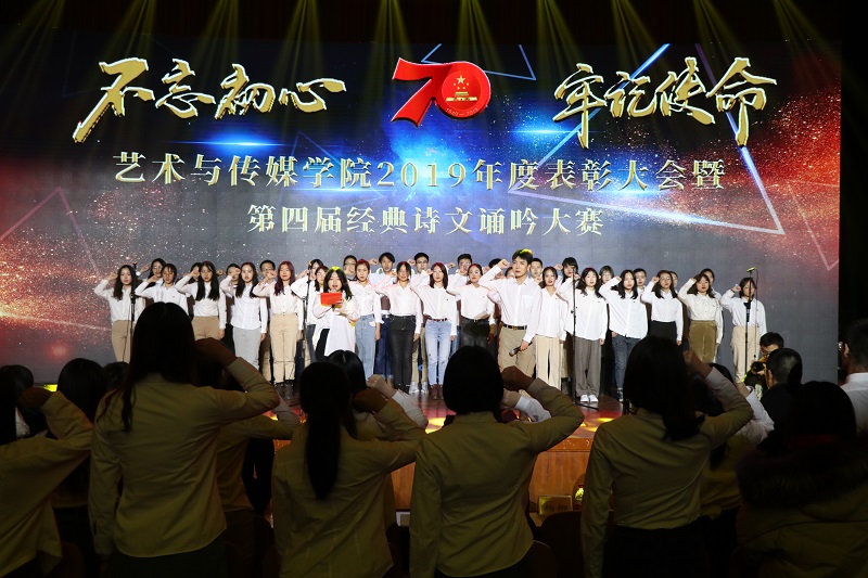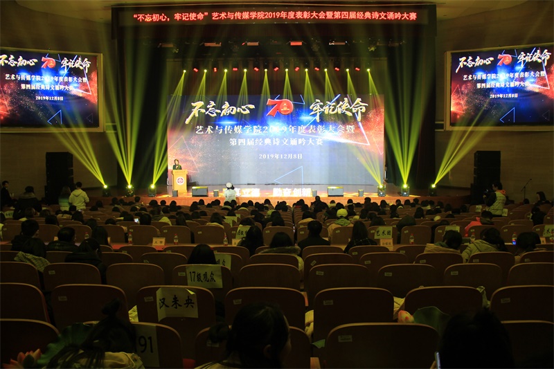 為深入推進“不忘初心、牢記使命”主題教育,紀念一二·九運動84周年,同時表彰先進集體和個人,弘揚愛國主義精神,傳承中華優秀傳統文化。12月8日,藝傳學院舉辦2019年度學生表彰大會暨第四屆經典詩文誦吟大賽。學院黨委書記高麗華、院長王擎、副院長劉紅菊、學院黨委副書記鄭光、院長助理李杰瓊及學院部分教職工出席大會,獲獎學生代表、全體學生黨員、團學干部、2019級學生以及部分高年級學生等共計700余人參會。