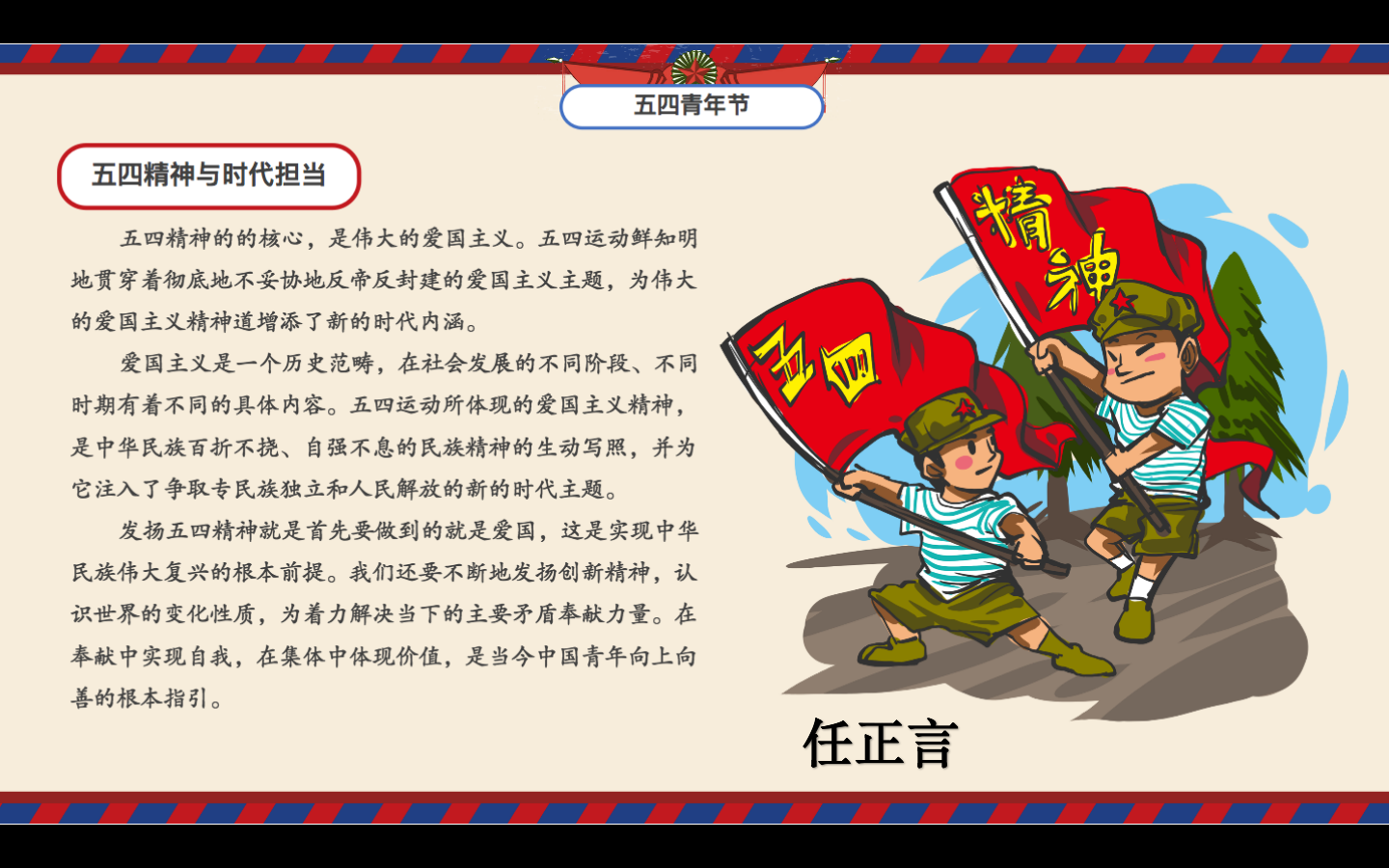 通過一系列主題團日活動的開展,廣大團員青年受到極大鼓舞,掀起了活動的熱潮。團員青年們深刻意識到時代賦予的新的使命,在新時代發揚五四精神,最根本的就是高舉愛國主義偉大旗幟,用青春之我創造青春之民族、青春之中國。青春之火,為民族而燃燒;青年之心,為祖國而跳動。大家紛紛表示,要牢記總書記對廣大青年的殷切囑托,“青春由磨礪而出彩,人生因奮斗而升華”。新時代中國青年要擔負時代使命,在擔當中歷練,在盡責中成長,讓青春在實現中國夢的奮進追逐中展現出勇敢奔跑的英姿。全體團員要從五四精神中汲取寶貴財富,熱愛偉大祖國,樹立遠大理想,擔當時代責任,勇于砥礪奮斗,練就過硬本領,錘煉品德修為,不懼風雨,勇挑重擔,把愛國之情化為報國之行,把實現自我價值的小我融入到實現中華民族偉大復興的大我中,奮發譜寫新時代中國青年的新篇章。