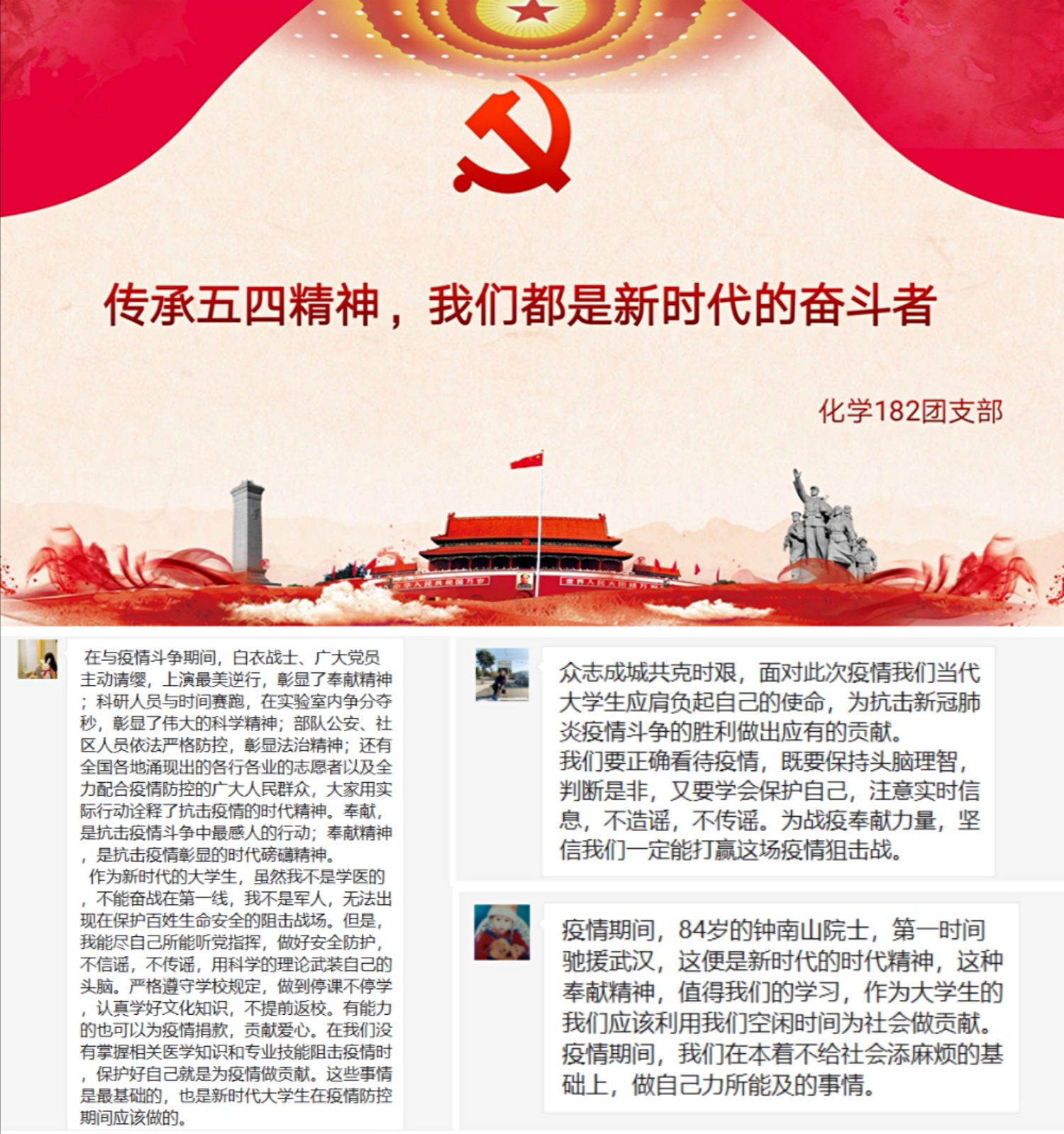 學校各級團委、團總支、團支部通過組織觀看線上主題教育視頻、學習團中央“五四青年節”特別團課、觀看五四青年節特別節目《奮斗的青春最美麗》、開展“新時代的英雄精神和如何以實際行動傳承五四精神”大討論、以書法繪畫作品致敬五四青春、以“奉獻青春,強國有我”為主題開展了線上朗誦活動、開展網絡互動、講述身邊的戰“疫”故事等形式開展團日活動。