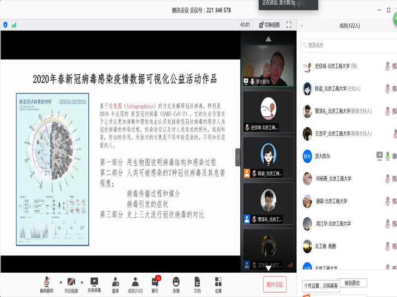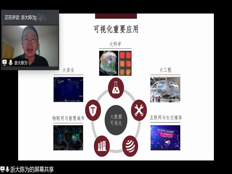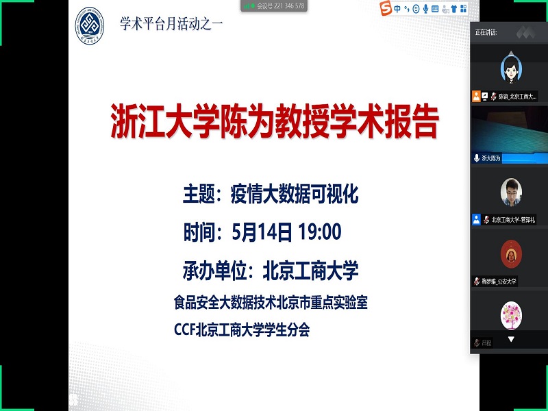 5月14日,重點實驗室2020年科技平臺月活動拉開了序幕。浙江大學CAD&CG國家重點實驗室副主任陳為教授應邀為我校師生做了題為“疫情大數據可視化”的學術報告。計算機學院、人工智能學院、電商與物流學院、傳媒與設計學院、以及校外多家單位的120余名師生在線聆聽了報告。報告會由食品安全大數據技術北京市重點實驗室主任陳誼教授主持。