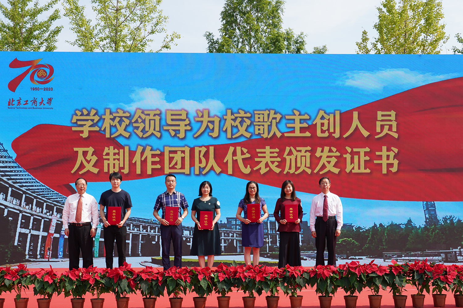 副校長張?jiān)判夹8韪柙~征集獲獎(jiǎng)名單。黨委書記黃先開、校長孫寶國為校歌主創(chuàng)人員及制作團(tuán)隊(duì)代表頒發(fā)證書,并與教師代表、學(xué)生代表、校友代表、校歌制作團(tuán)隊(duì)代表共同啟動(dòng)電子屏,正式發(fā)布校歌,“玉淵潭清,永定河長,這里有我親愛的北工商”,悠揚(yáng)振奮的校歌響徹北工商校園,千千萬萬北工商人在“云端”隨著音樂感懷青春歲月,感恩母校的辛勤培育!