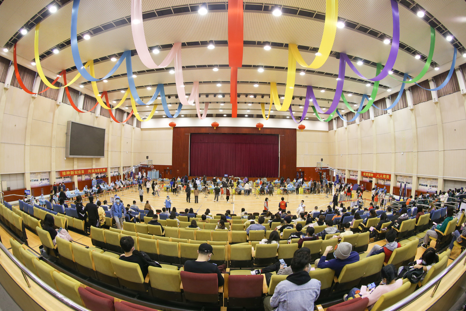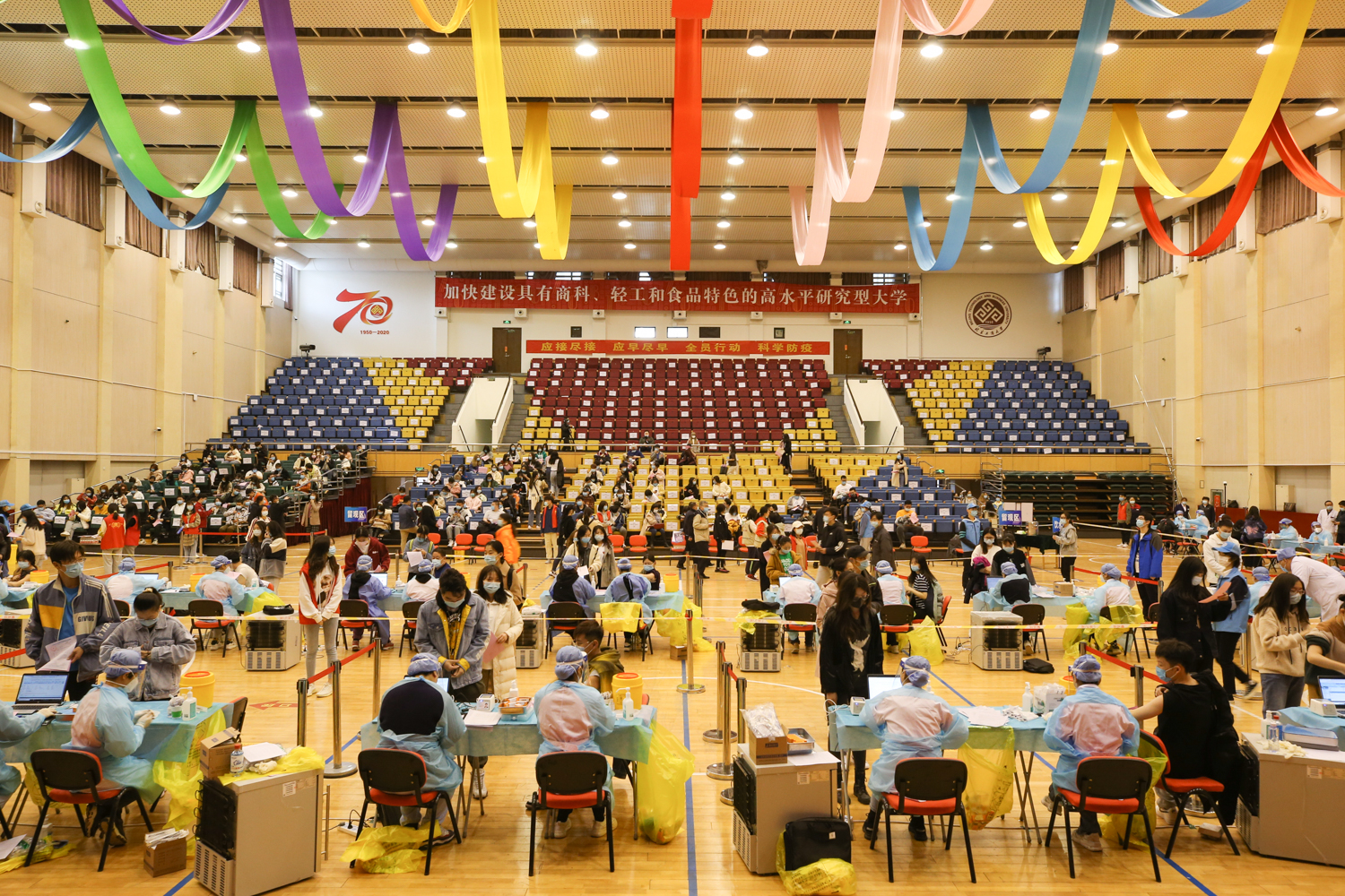 此次疫苗接種場地設置在良鄉校區文體館,設立5個分區、15個接種臺,醫務人員數量50人。通過科學規劃分區,等待、咨詢、登記、接種、留觀、離場 ,形成閉環管理,疫苗接種流程及防疫工作秩序井然、安全高效。210名志愿者們積極報名參與接種工作。接種日,志愿者們分4個時段上崗,每時段20人,全程為接種同學們提供貼心、細致服務。