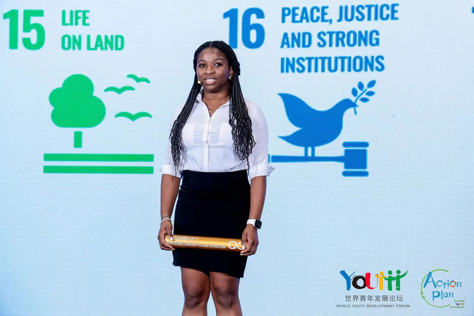 我校語言與傳播學院廣告系黃桂麗和莎娜分別點亮了第9項和第12項目標。黃桂麗談到:“我來自柬埔寨,來到中國兩個月后,我發現強大的基礎設施是中國工業發展和創新的必要基礎。2030年,我主張支持發展中國家的本土技術開發、研究和創新。”莎娜倡議:“我來自來自安提瓜和巴布達,已經來到中國4年了。在2030年,我建議通過預防、減排、回收和再利用來大幅減少廢物的產生。”論壇最后,共青團中央書記處書記、全國青聯負責人胡盛與17名中外青年共同點亮象征著聯合國可持續發展目標的SDGs彩燈。
