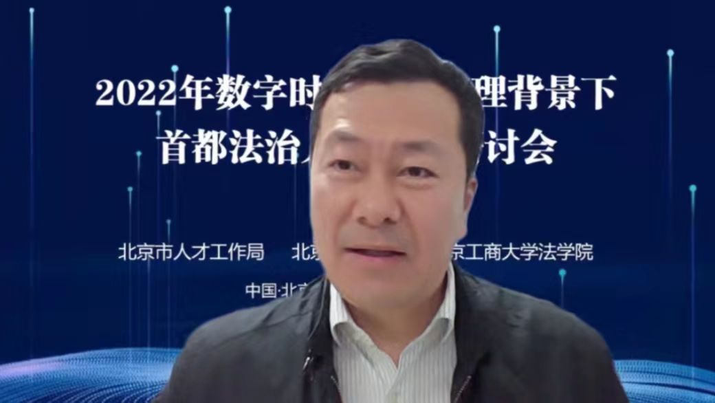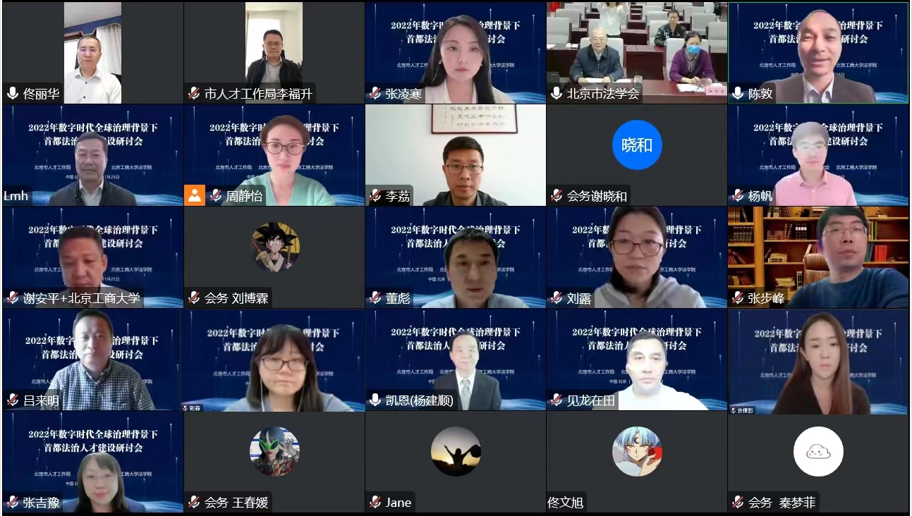 11月25日,由北京市人才工作局、北京市法學(xué)會(huì)與北京工商大學(xué)聯(lián)合舉辦的“2022年首都法學(xué)家沙龍——數(shù)字時(shí)代全球治理背景下首都法治人才建設(shè)研討會(huì)”通過線上會(huì)議形式召開。北京市人才工作局綜合協(xié)調(diào)處副處長(zhǎng)李福升,北京市法學(xué)會(huì)一級(jí)巡視員賈沫微,學(xué)校黨委常委、副校長(zhǎng)劉敏華出席會(huì)議。來自北京市人才工作局、北京市法學(xué)會(huì)、北京大學(xué)、中國(guó)人民大學(xué)、中國(guó)政法大學(xué)、中央民族大學(xué)、北京市致誠(chéng)律師事務(wù)所、北京工商大學(xué)等單位的領(lǐng)導(dǎo)和專家40余人參加會(huì)議。研討會(huì)由法學(xué)院副院長(zhǎng)(主持工作)陳敦主持。