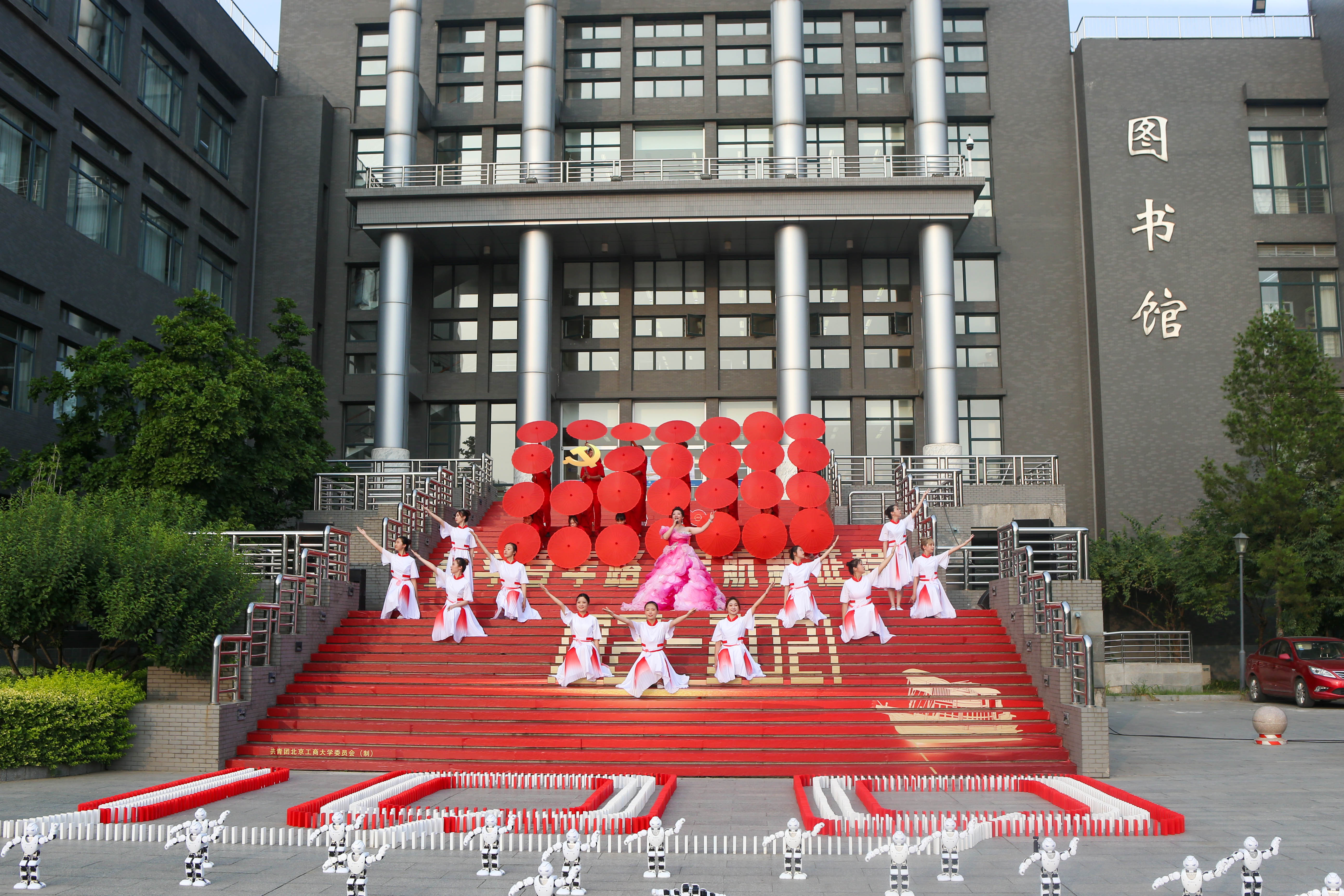 傍晚6時整,圖書館前成了一片紅色的海洋,20米紅色巨布鋪滿三層長階, 鐫刻著“1921-2021”的字樣和金色紅船的圖案,營造成熱烈而濃郁的氛圍,讓現場師生聯想到從上海石庫門到嘉興南湖,一艘小小紅船承載著人民的重托、民族的希望,越過急流險灘,穿過驚濤駭浪,航行百年,成為領航中國行穩致遠的巍巍巨輪。伴隨著管樂器吹奏著《唱支山歌給黨聽》悠揚樂曲,剛剛下課的同學們三三兩兩,紛紛循聲匯聚到圖書館前。管弦樂曲罷,領唱體育與藝術教學部丁璇用動聽而又極富感染力的歌聲唱響《我愛你,中國》,歌聲里滿是對祖國未來的憧憬和對黨百年征程的歌頌。紅色長階上數十名舞者身著白衣紅裙翩翩起舞,妙態絕倫。二十五個智能舞蹈機器人擺成黨徽的形狀,跟著歌聲的節奏跳動,整齊劃一,靈動的舞姿和可愛的形象俘獲了現場師生的心,象征著北工商學子整裝待發,開啟百年新征程的意志。人工智能學院的“NAO”機器人矗立在舞蹈機器人的前方,指引方向,代表著工商青年堅定信心跟黨走,始終堅持中國共產黨領導的信心。