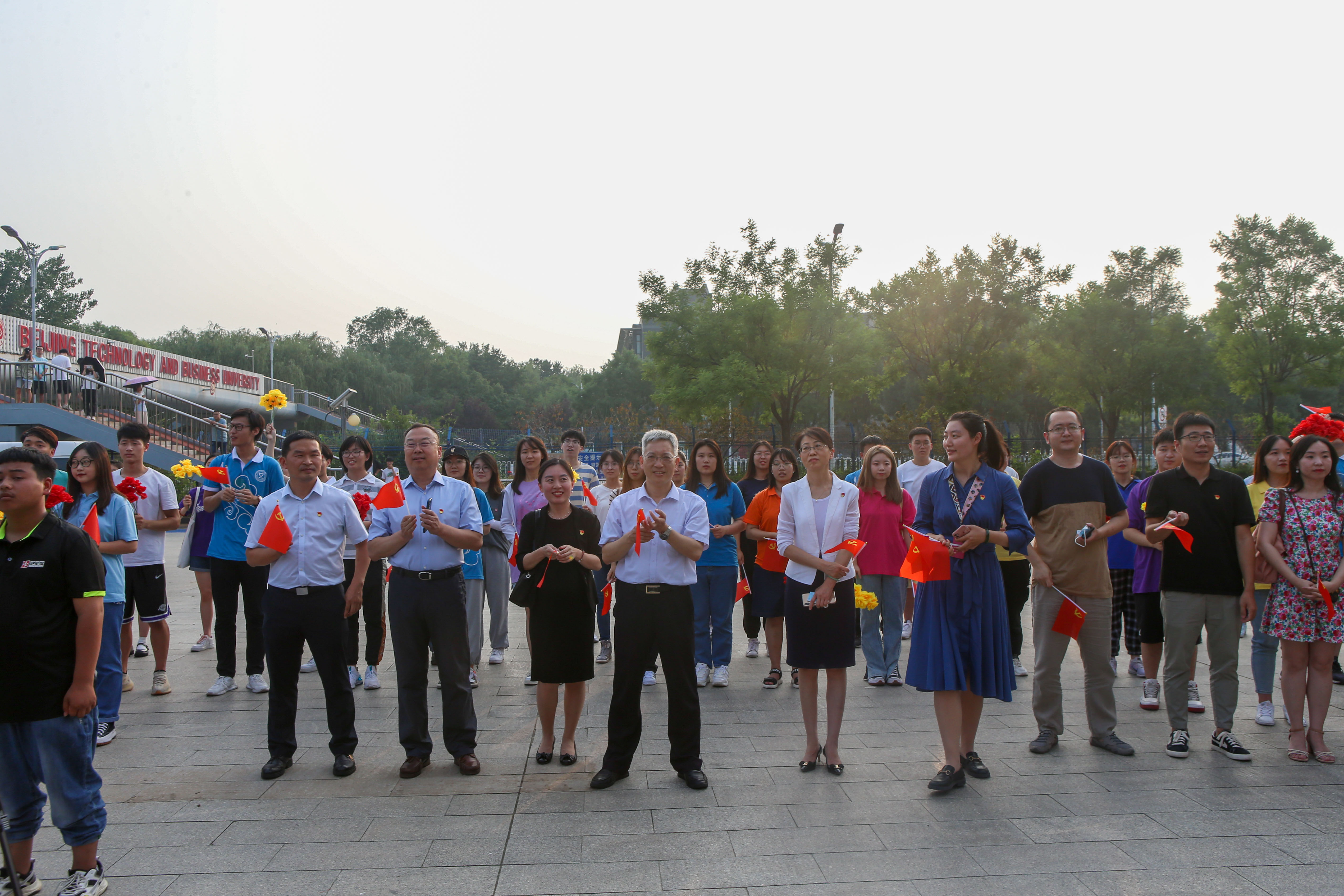 “唱支山歌給黨聽,我把黨來比母親……”6月28日下午,學校良鄉主校區傳出了一陣陣悠揚而又動人的歌聲。數百名同學伴著悠揚的音樂,揮舞著手中的黨旗和花朵,洋溢著青春活力在圖書館廣場激情高歌。“奮進百年路,啟航新征程”北工商團員青年唱響百年頌歌主題教育“快閃”正在上演。學校黨委副書記李中奇出席活動。相關職能部門負責人與同學們一起,用歌聲唱響黨的百年頌歌。