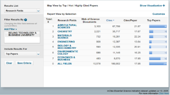 據(jù)科睿唯安(Clarivate)2025年7月發(fā)布的最新一期《基本科學(xué)指標(biāo)數(shù)據(jù)庫(kù)》(Essential Science Indicators,簡(jiǎn)稱ESI)統(tǒng)計(jì)數(shù)據(jù)顯示,北京工商大學(xué)經(jīng)濟(jì)學(xué)與商學(xué)(Economics & Business)學(xué)科首次進(jìn)入ESI全球排名前1%,實(shí)現(xiàn)學(xué)科建設(shè)歷史性突破,標(biāo)志著我校經(jīng)濟(jì)學(xué)與商學(xué)進(jìn)入國(guó)際高水平學(xué)科行列。我校目前已進(jìn)入ESI前1%的7個(gè)學(xué)科具體表現(xiàn)如下: