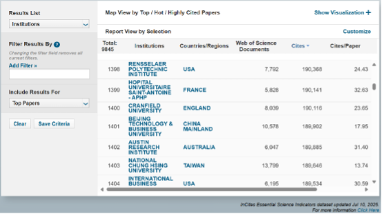 ESI數(shù)據(jù)庫(kù)共分22個(gè)學(xué)科領(lǐng)域,是基于科睿唯安Web of Science(SCIE/SSCI)所收錄的全球12000多種學(xué)術(shù)期刊的1000多萬(wàn)條文獻(xiàn)記錄而建立的計(jì)量分析數(shù)據(jù)庫(kù)。以10年為1個(gè)周期對(duì)全球所有大學(xué)及科研機(jī)構(gòu)的SCI、SSCI論文及其引用情況等進(jìn)行統(tǒng)計(jì)和比較,按論文被引次數(shù)排列在前1%的學(xué)科方可進(jìn)入ESI學(xué)科排行,同時(shí)給出排名進(jìn)入全球前1%的大學(xué)及科研機(jī)構(gòu)的排序,每2個(gè)月更新公布1次。ESI數(shù)據(jù)庫(kù)通過(guò)論文數(shù)、論文被引頻次、論文篇均被引頻次、高被引論文、熱點(diǎn)論文和前沿論文等6大指標(biāo),從各個(gè)角度對(duì)國(guó)家/地區(qū)科研水平、機(jī)構(gòu)學(xué)術(shù)聲譽(yù)、科學(xué)家學(xué)術(shù)影響力以及期刊學(xué)術(shù)水平進(jìn)行全面衡量,已成為當(dāng)今世界范圍內(nèi)普遍用以評(píng)價(jià)高校、學(xué)術(shù)機(jī)構(gòu)、國(guó)家/地區(qū)國(guó)際學(xué)術(shù)水平及影響力的重要評(píng)價(jià)指標(biāo)工具之一。