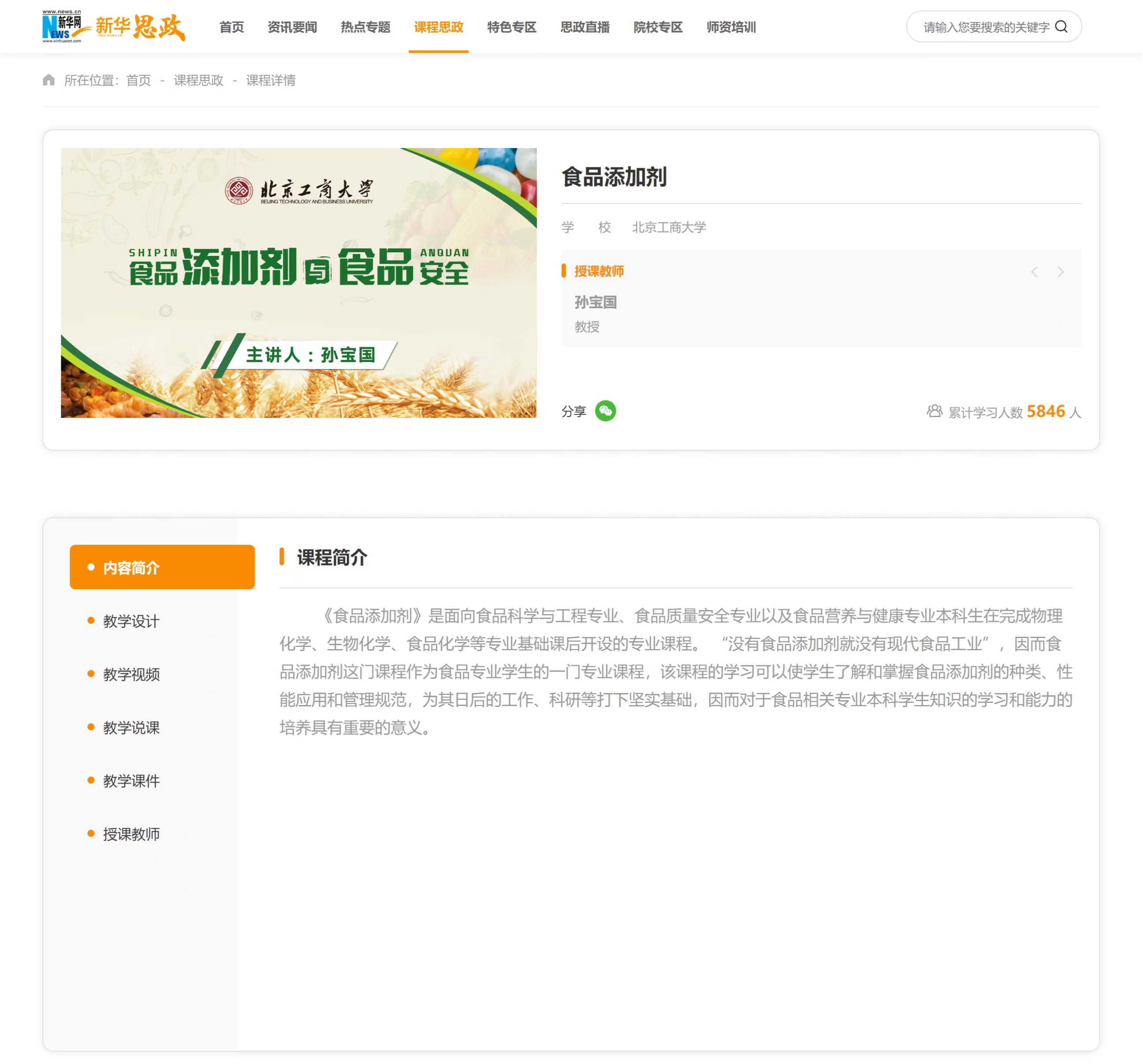 5月16日,從新華網獲悉,我校課程思政優秀案例課程《食品添加劑》在“新華思政”-全國高校課程思政教學資源服務平臺上線,面向全社會開放共享,該課程獲新華課程思政欄目重點推薦。