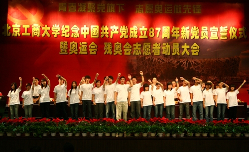 上午10點,文體館里聚集了1982名來自良鄉校區、阜成路校區的全體賽會志愿者、專業禮儀志愿者和城市志愿者。大會在國歌聲中拉開帷幕,全體新黨員宣誓、老黨員重溫入黨誓詞。此次宣誓入黨的新黨員全部是志愿者。在黨員們堅定、嘹亮的誓詞之后,臺上領導為新黨員代表發放黨徽并配帶微笑圈。新黨員代表新聞051的李明英同學在發言中表示,她由共青團員成長為一名共產黨預備黨員,同時也成為一名優秀的志愿者。在參加志愿者培訓的過程中所有的黨員志愿者都同她一樣,希望黨徽在賽場上發光、感動周圍的人,讓他們的夢想和莊嚴承諾與青春一同凝聚黨旗下,讓他們的微笑成為北工商永遠的驕傲。