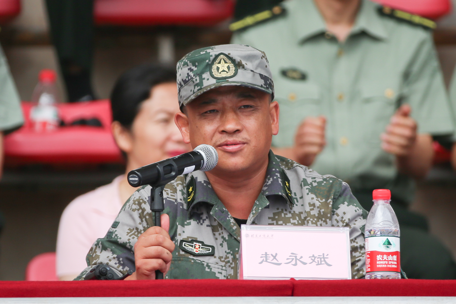 軍訓(xùn)團(tuán)趙永斌團(tuán)長作軍訓(xùn)總結(jié),他代表軍訓(xùn)團(tuán)全體教官誠摯地向?qū)W校領(lǐng)導(dǎo)和老師們致以崇高的敬意和衷心的感謝,向所有軍訓(xùn)團(tuán)的同學(xué)們表示熱烈的祝賀。本次軍訓(xùn),學(xué)校領(lǐng)導(dǎo)和教官團(tuán)隊(duì)特別優(yōu)化設(shè)計(jì)了訓(xùn)練課目,同學(xué)們高標(biāo)準(zhǔn)完成了所有軍訓(xùn)任務(wù):隊(duì)列訓(xùn)練中的堅(jiān)韌、拉歌時(shí)的熱情、拉練中的剛毅、歌詠比賽時(shí)的豪邁,觀影時(shí)的愛國熱忱,聆聽報(bào)告會(huì)時(shí)的赤子情懷,完美展現(xiàn)了北工商青年學(xué)子的風(fēng)采。他希望學(xué)子們在此次軍訓(xùn)中不僅僅收獲一套技能,更希望是一次軍旅精神火炬的傳接,希望這團(tuán)螢螢的火種,陪伴大家攻克學(xué)習(xí)的難題,跨越工作上的高山險(xiǎn)峰!
