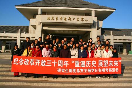 12月13日,研究生部黨總支組織了“紀(jì)念改革開放三十周年 ‘重溫歷史 展望未來’”主題黨日活動(dòng)。研究生部黨總支書記董竹娟、副書記熊慧,以及其他老師和部分研究生黨員和學(xué)生干部共同組成的考察小組,開赴天津進(jìn)行了為期一天的考察參觀活動(dòng)。考察小組先后趕往天津商業(yè)大學(xué)、周恩來鄧穎超紀(jì)念館、平津戰(zhàn)役紀(jì)念館等地進(jìn)行了實(shí)地考察,重溫我黨輝煌歷史功績(jī),感受改革開放巨大成果。