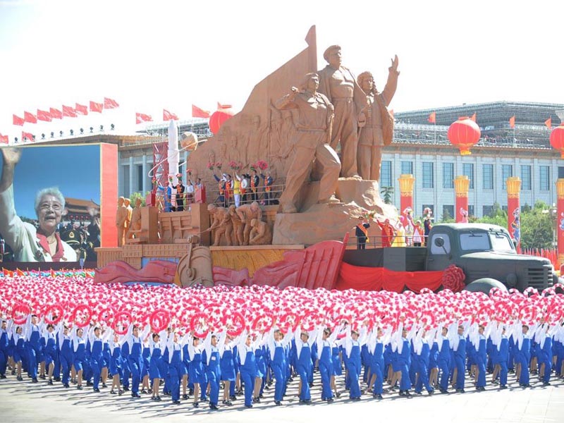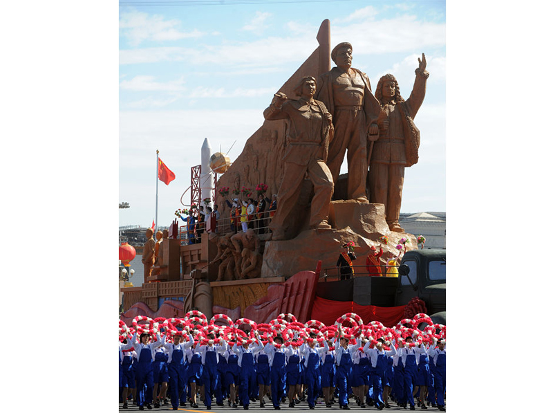 上午11點(diǎn)27分,隨著指揮官一聲令下,由我校師生為主要成員的“艱苦創(chuàng)業(yè)”方陣邁著整齊而堅(jiān)定的步伐向著天安門走去。隨著音樂節(jié)奏的變化,方陣成員們做著不同的動(dòng)作:他們時(shí)而徒手握拳作奮斗的手勢(shì),時(shí)而把花環(huán)放在胸前有節(jié)奏的搖動(dòng),當(dāng)方陣走到天安門正前方的時(shí)候,所有隊(duì)員一齊把花環(huán)高高舉過頭頂,整個(gè)方隊(duì)瞬間成為一片繁花似錦的海洋。這激動(dòng)人心的一幕深深感染了在場(chǎng)檢閱的國家領(lǐng)導(dǎo)人和參加觀禮的各界群眾,大家都情不自禁的鼓起掌來。