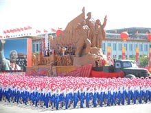 10月1日上午,天安門廣場(chǎng)晴空萬里,陽光明媚,花團(tuán)錦簇,喜氣洋洋。八個(gè)高達(dá)兩米多的大紅燈籠在天安門城樓上高高掛起,56根象征民族大團(tuán)結(jié)的朱紅團(tuán)結(jié)柱分立兩旁。首都各界人士齊聚在天安門廣場(chǎng),共同慶祝偉大祖國的六十華誕。